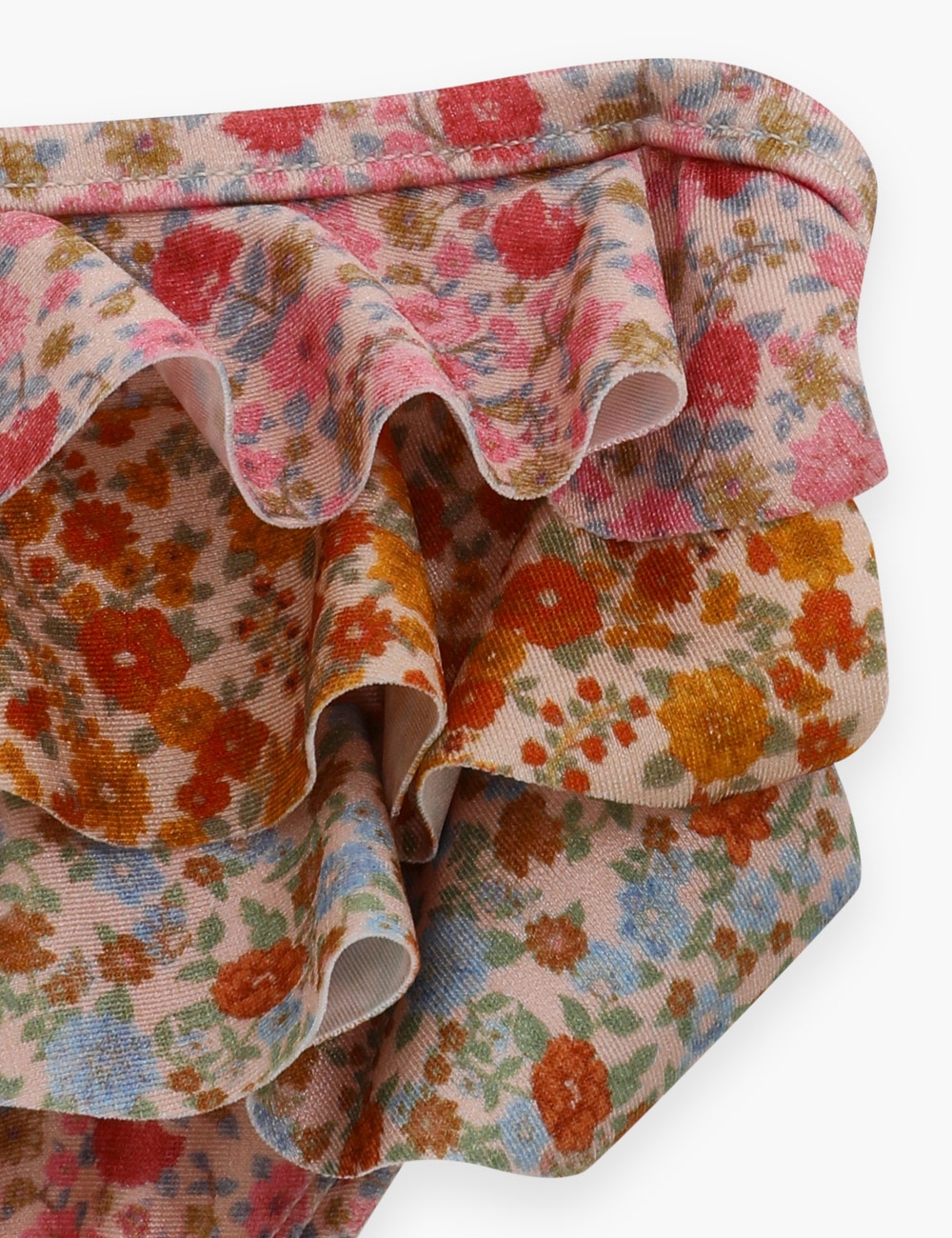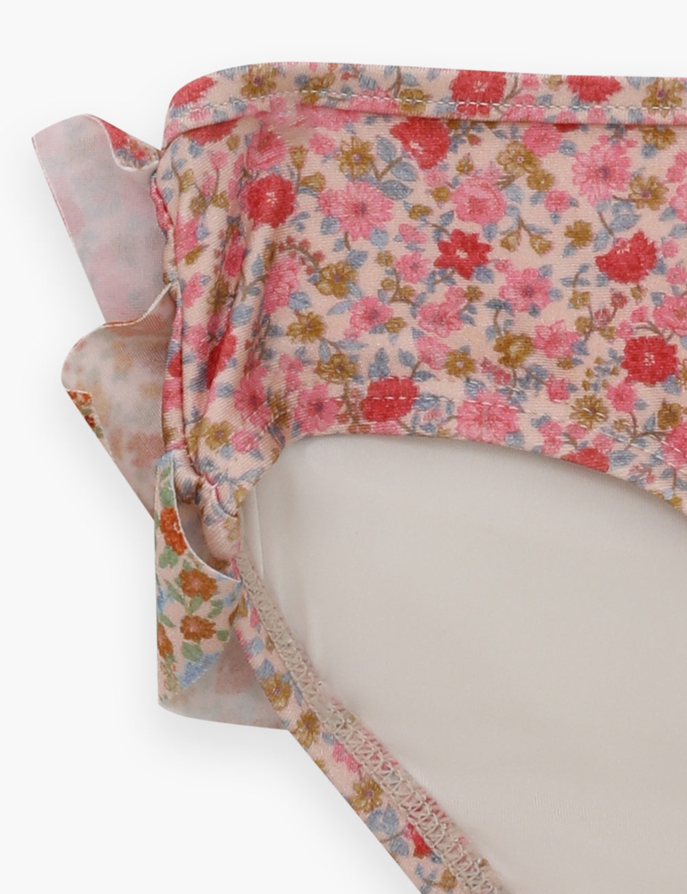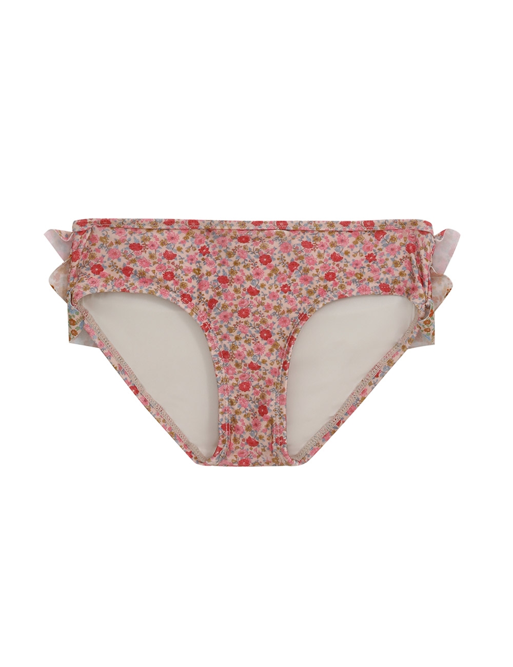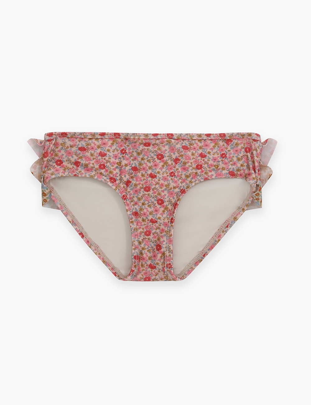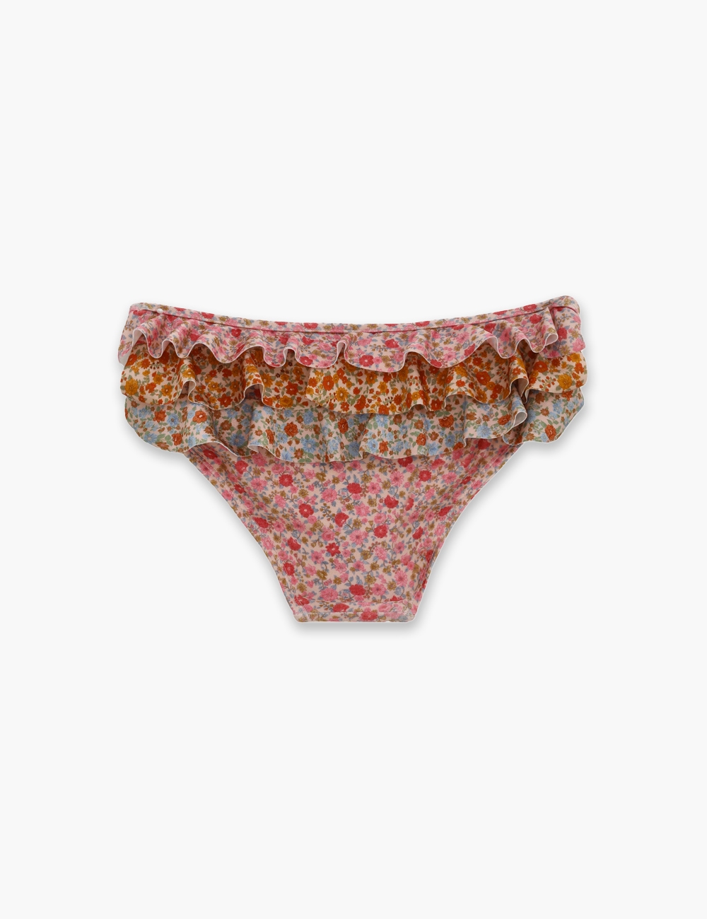 The Lucky Kids Frill Bikini Pant in Spliced from our Summer Swim 2025 Collection. A kids bikini pant with a triple frill detail at back.kids bikini swim bottom, lycra with shiny finish, bikini bottom with contrasting raw cut triple frill, pant only, top sold separately