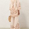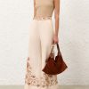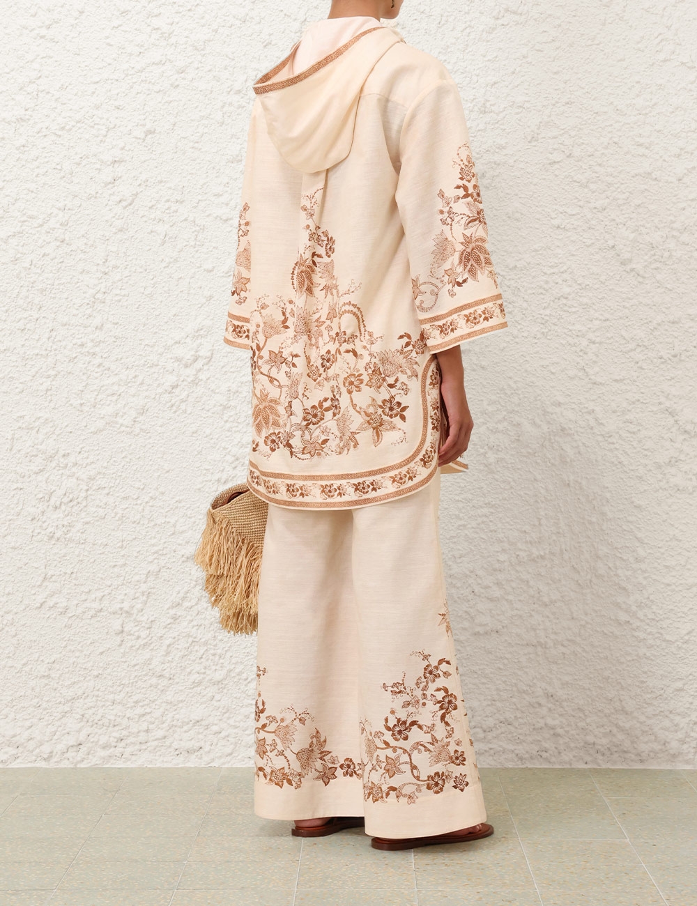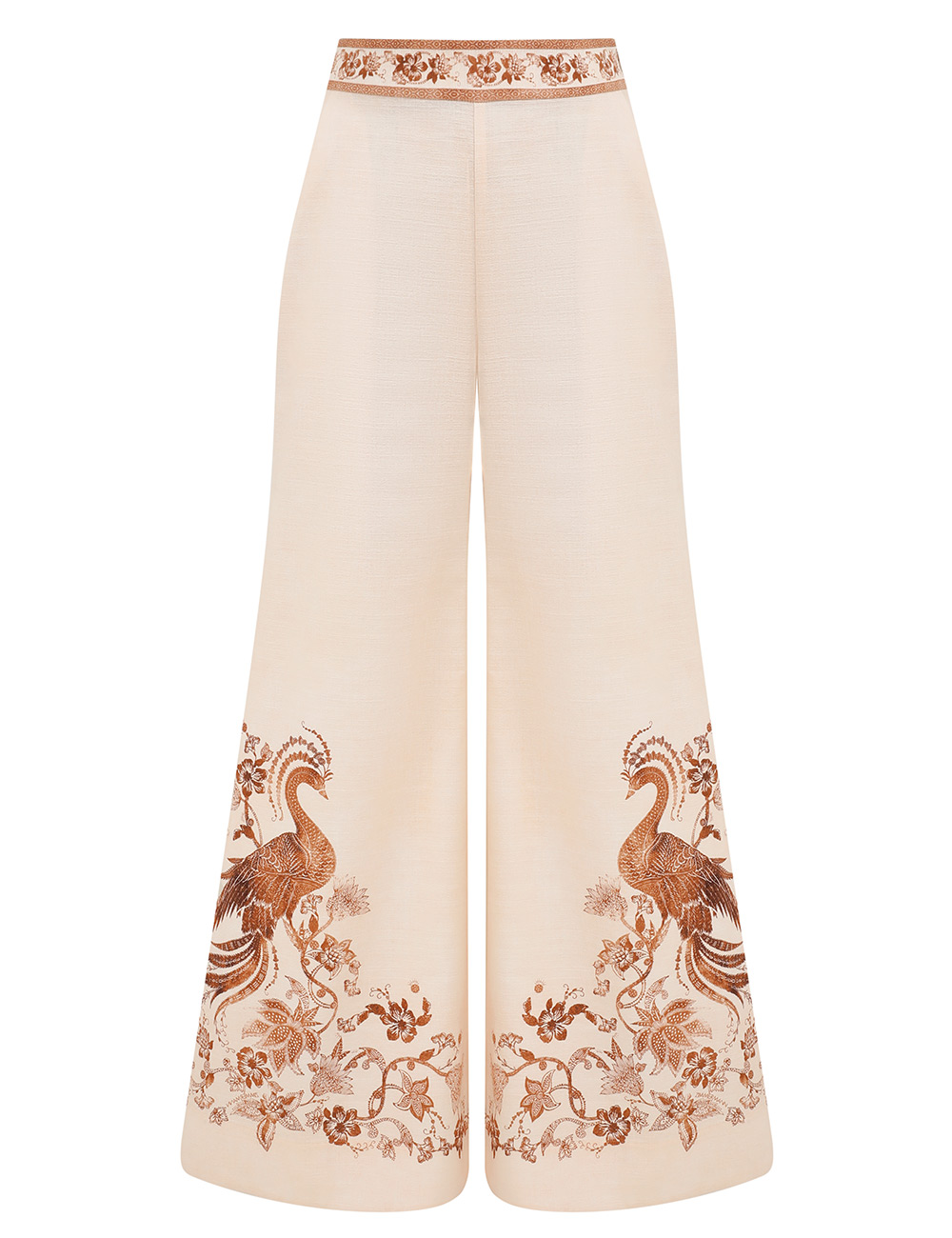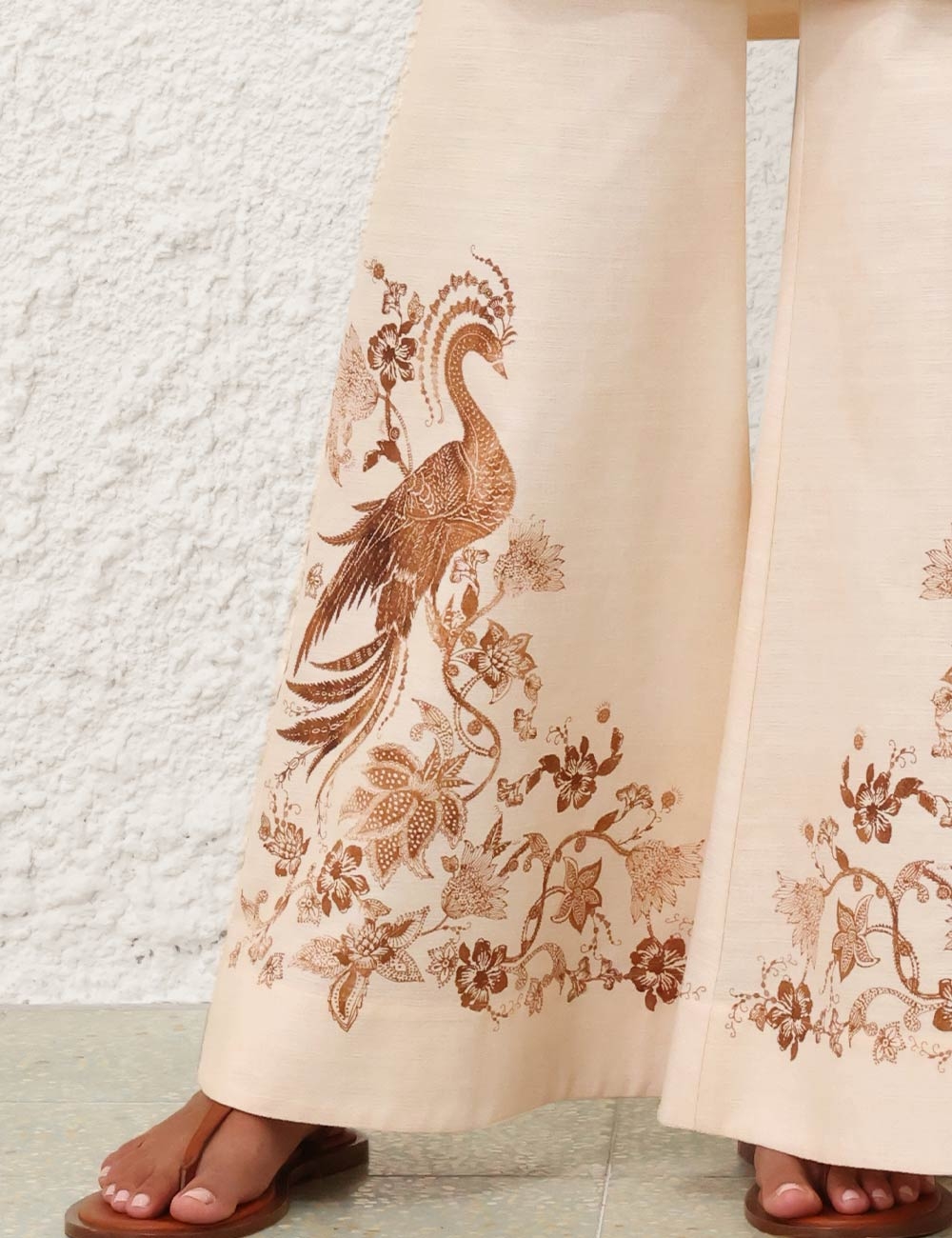 The Ascension Flare Pant in Cream/Tan Floral from our Summer Swim 2025 Collection. A flared cotton pant featuring an elasticated waist and functional side pockets.100% cotton fabric, wide leg pant, elasticated back waistband flared hem, functional pockets at the hip, side seam zipper at the left side