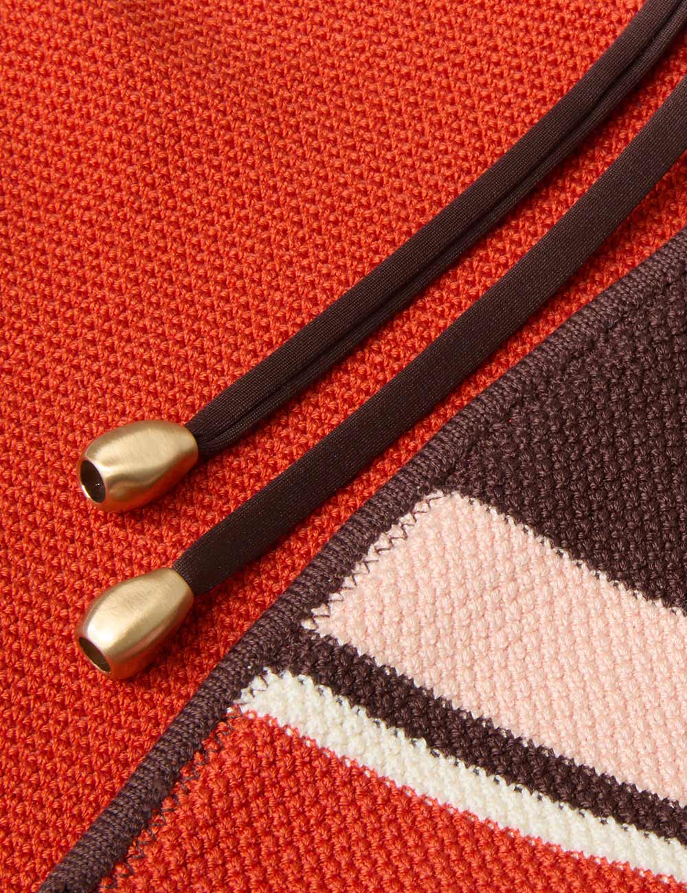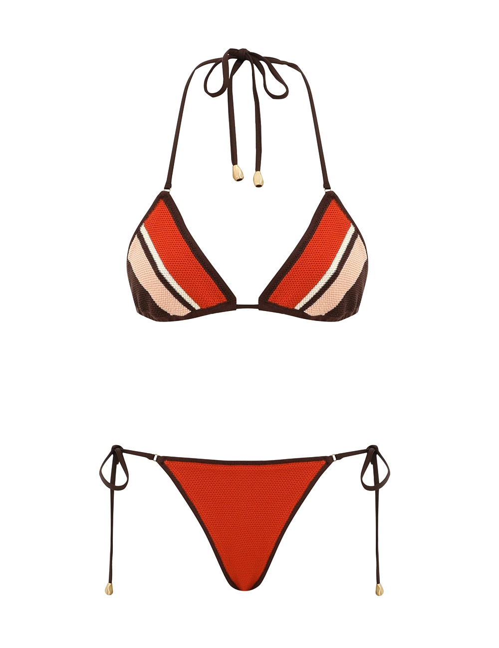 The Acension Knit Tri Bikini in Multi from our Summer Swim 2025 Collection. A crochet bikini set featuring self tie straps with toggle ends. lycra bikini with crochet detailing, triangle top, straps with toggle ends, moderate bottom coverage