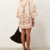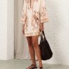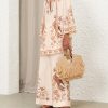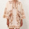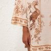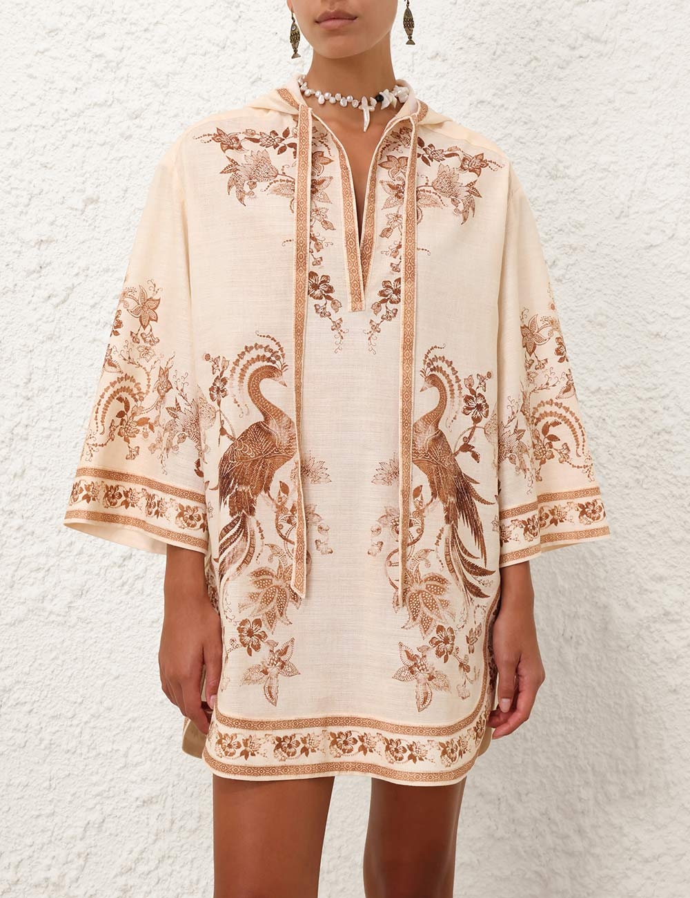The Ascension Tunic Mini Dress in Cream/Tan Floral from our Summer Swim 2025 Collection. A tunic mini dress featuring a deep V-neckline, wide sleeves and a hood with a self rouleau neck tie. , 100% cotton fabric, plunging v-neckline, hood with neck tie, long, wide sleeves, side splits below hip