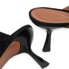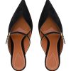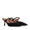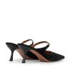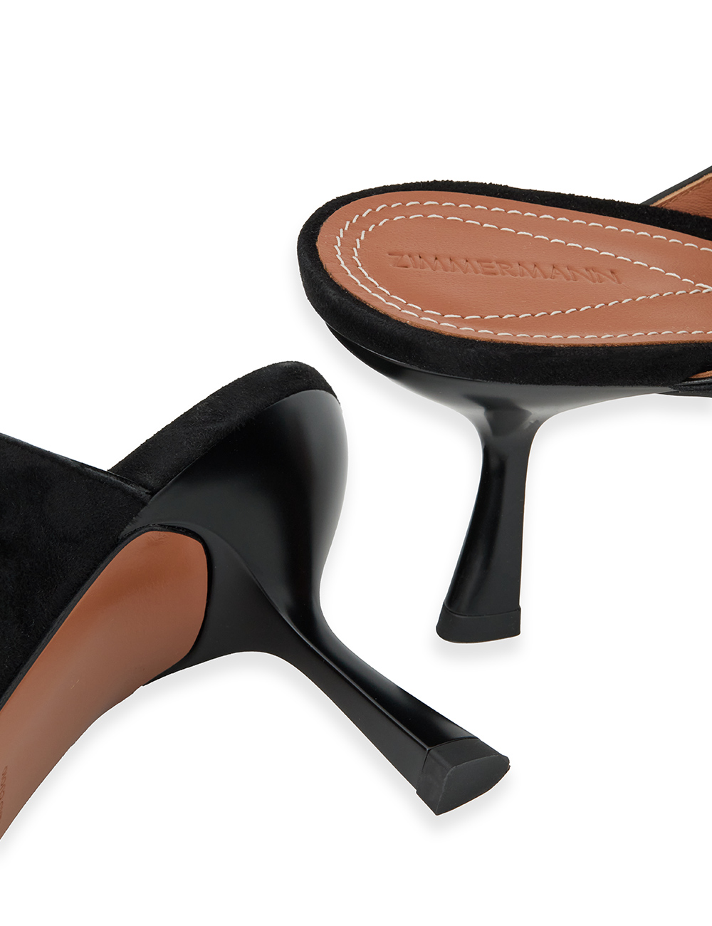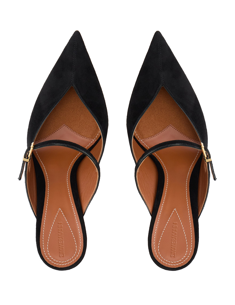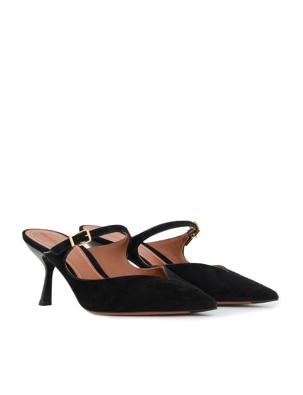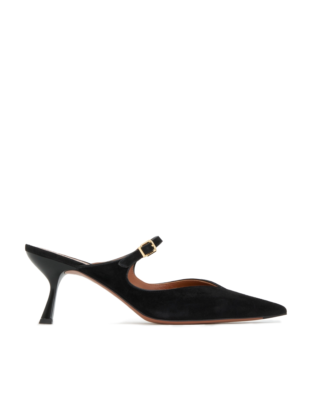 The Aura Mule 65 in Black from our Fall 2025 Collection, Hypnotic. Crafted in Italy, Aura adds effortless elegance to every occasion. suede mule, sweetheart silhouette, pointed toe, adjustable gold buckle hardware, 65mm stiletto heel, made in italy