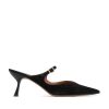 The Aura Mule 65 in Black from our Fall 2025 Collection, Hypnotic. Crafted in Italy, Aura adds effortless elegance to every occasion. suede mule, sweetheart silhouette, pointed toe, adjustable gold buckle hardware, 65mm stiletto heel, made in italy