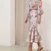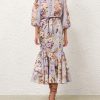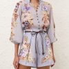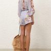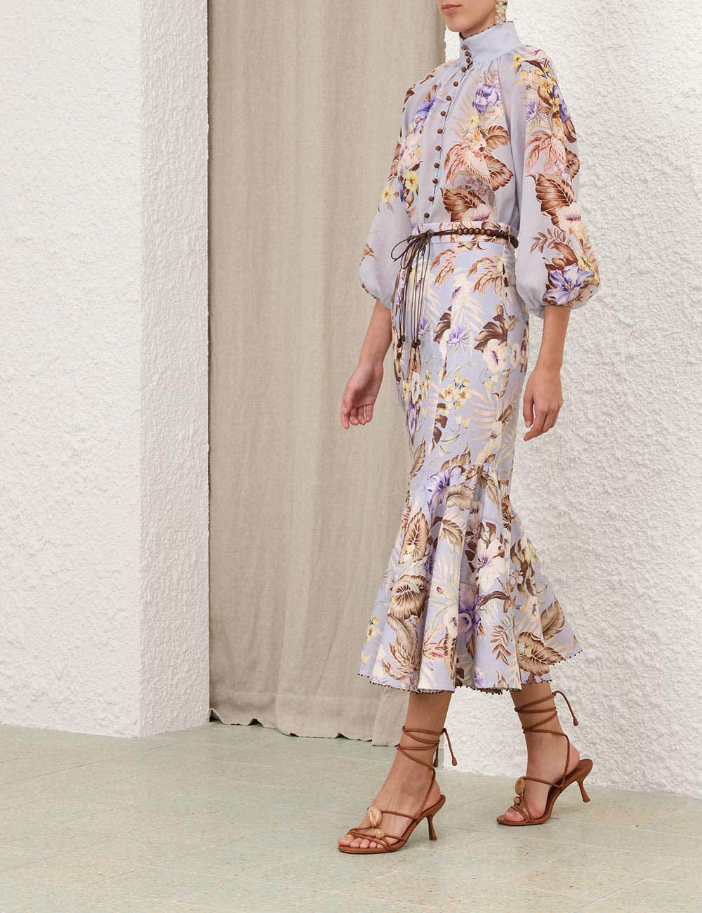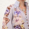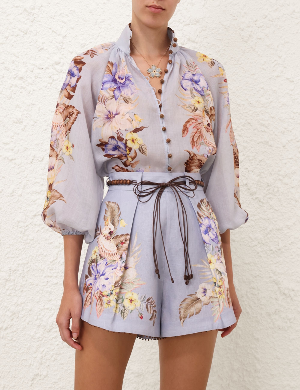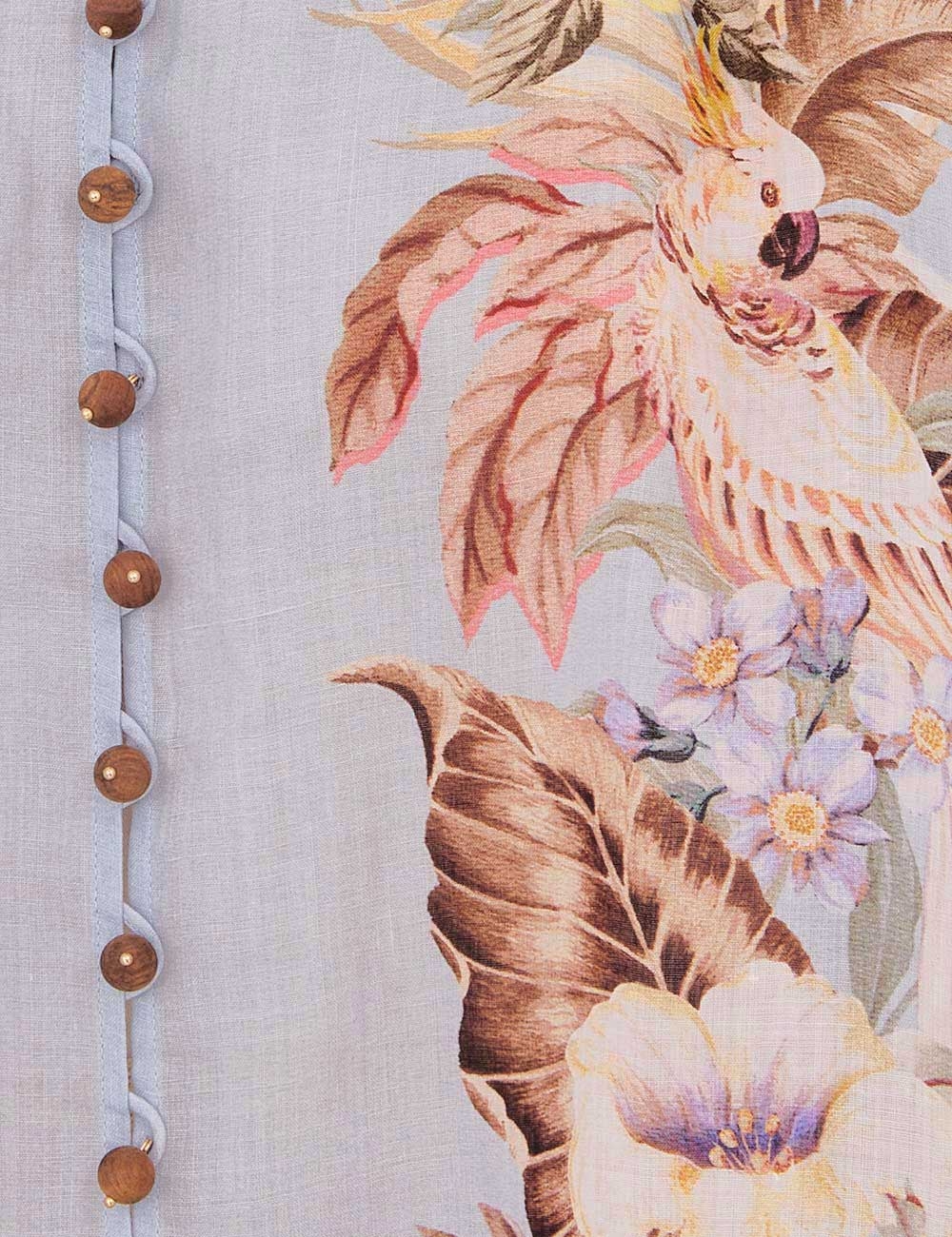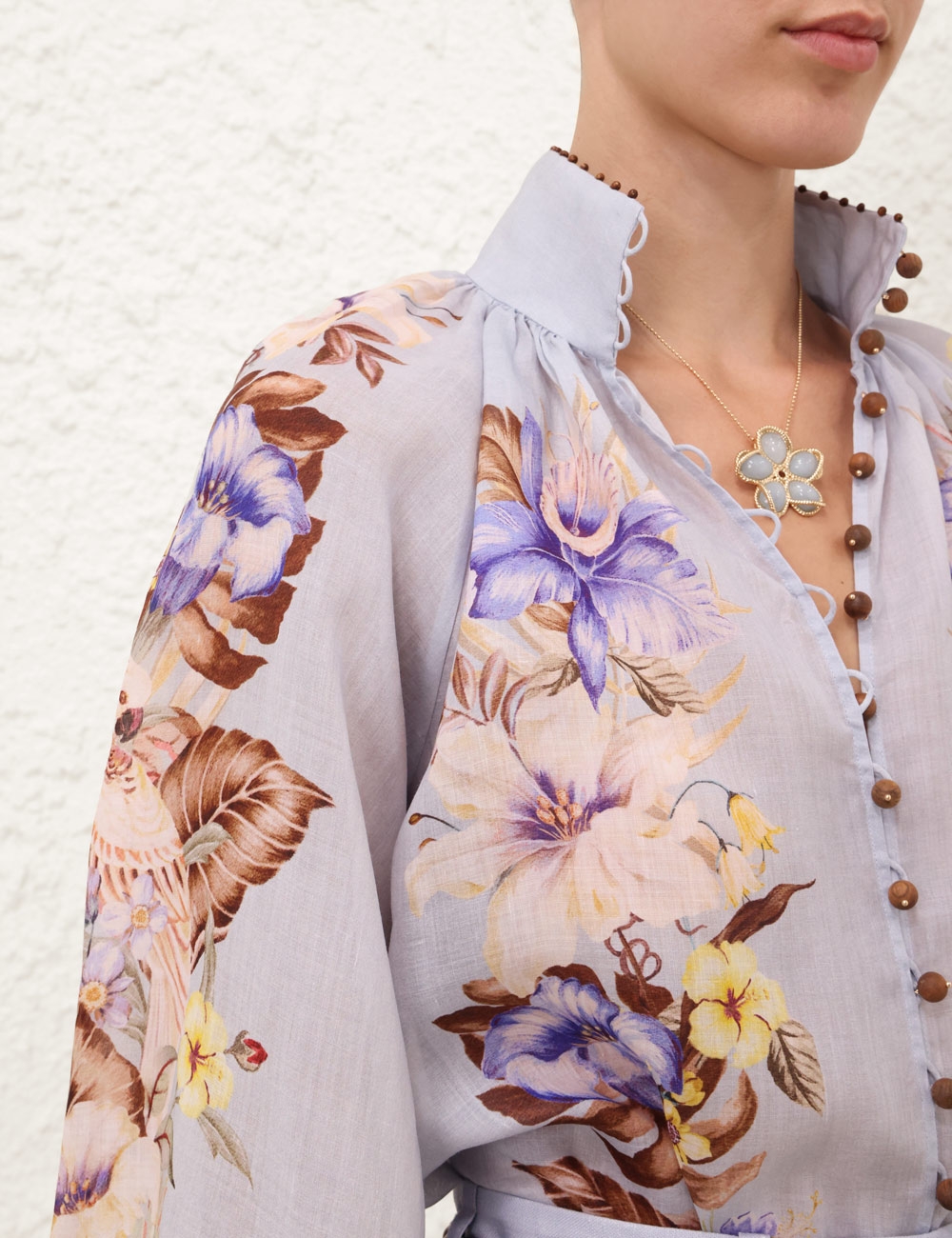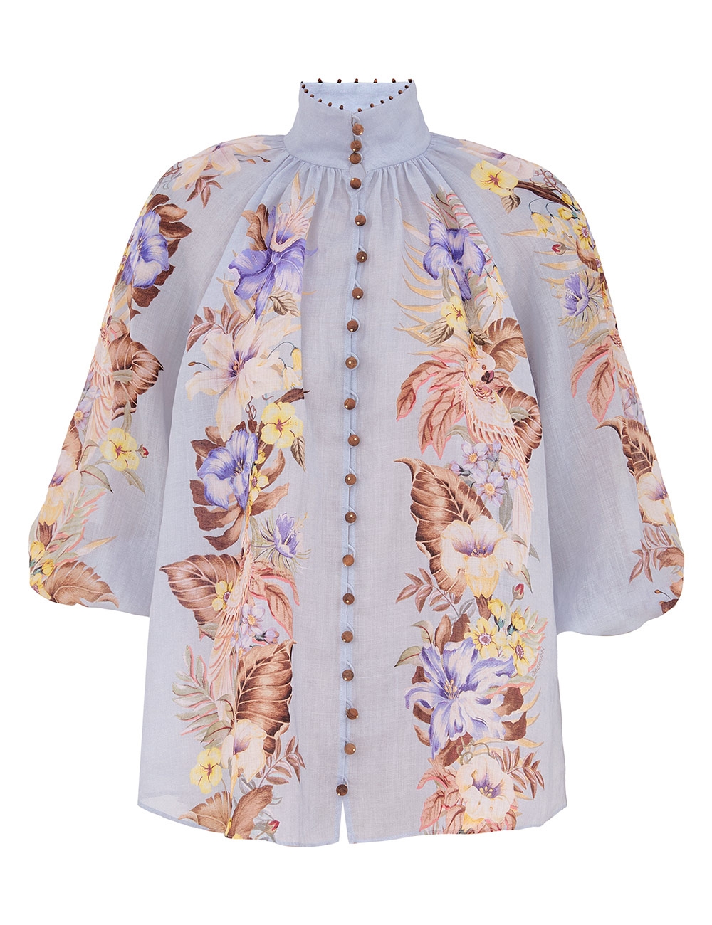 The Coco Billow Blouse in Powder Blue Multi Floral from our Summer Swim 2025 Collection. A ramie placement print blouse featuring rouleau loops and buttons down the centre front.100% ramie fabric, high neckline with gathering, elasticated sleeve cuffs for versatile sleeve length, rouleau loops with beaded buttons, wooden beaded detail along the stand collar