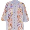The Coco Billow Blouse in Powder Blue Multi Floral from our Summer Swim 2025 Collection. A ramie placement print blouse featuring rouleau loops and buttons down the centre front.100% ramie fabric, high neckline with gathering, elasticated sleeve cuffs for versatile sleeve length, rouleau loops with beaded buttons, wooden beaded detail along the stand collar
