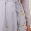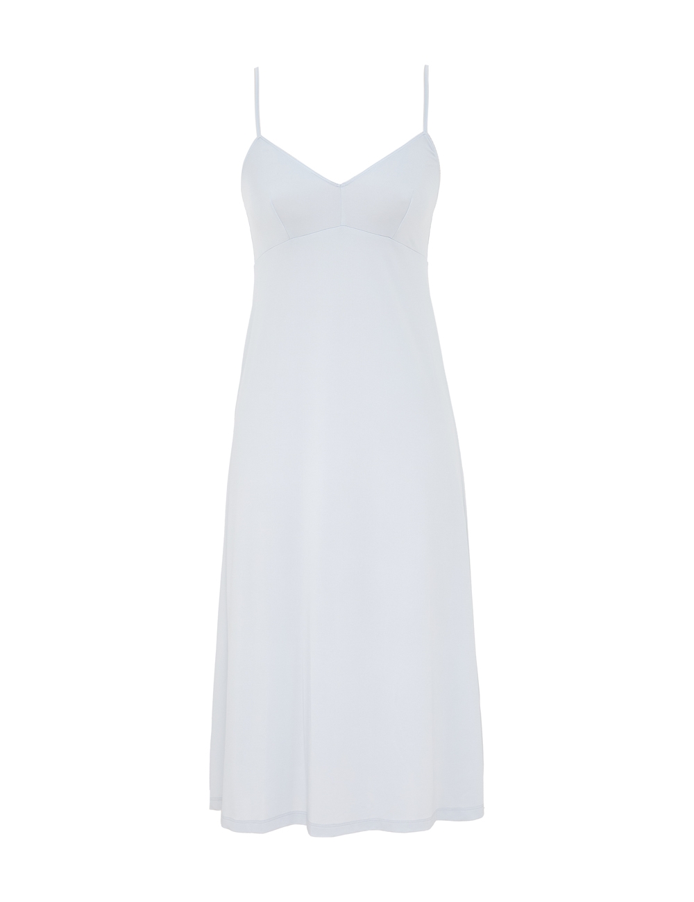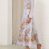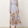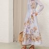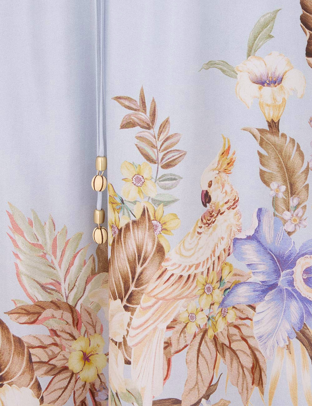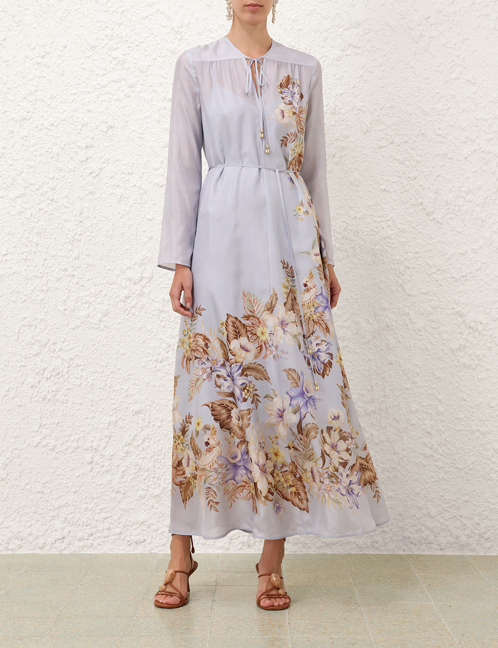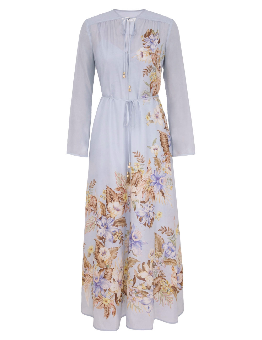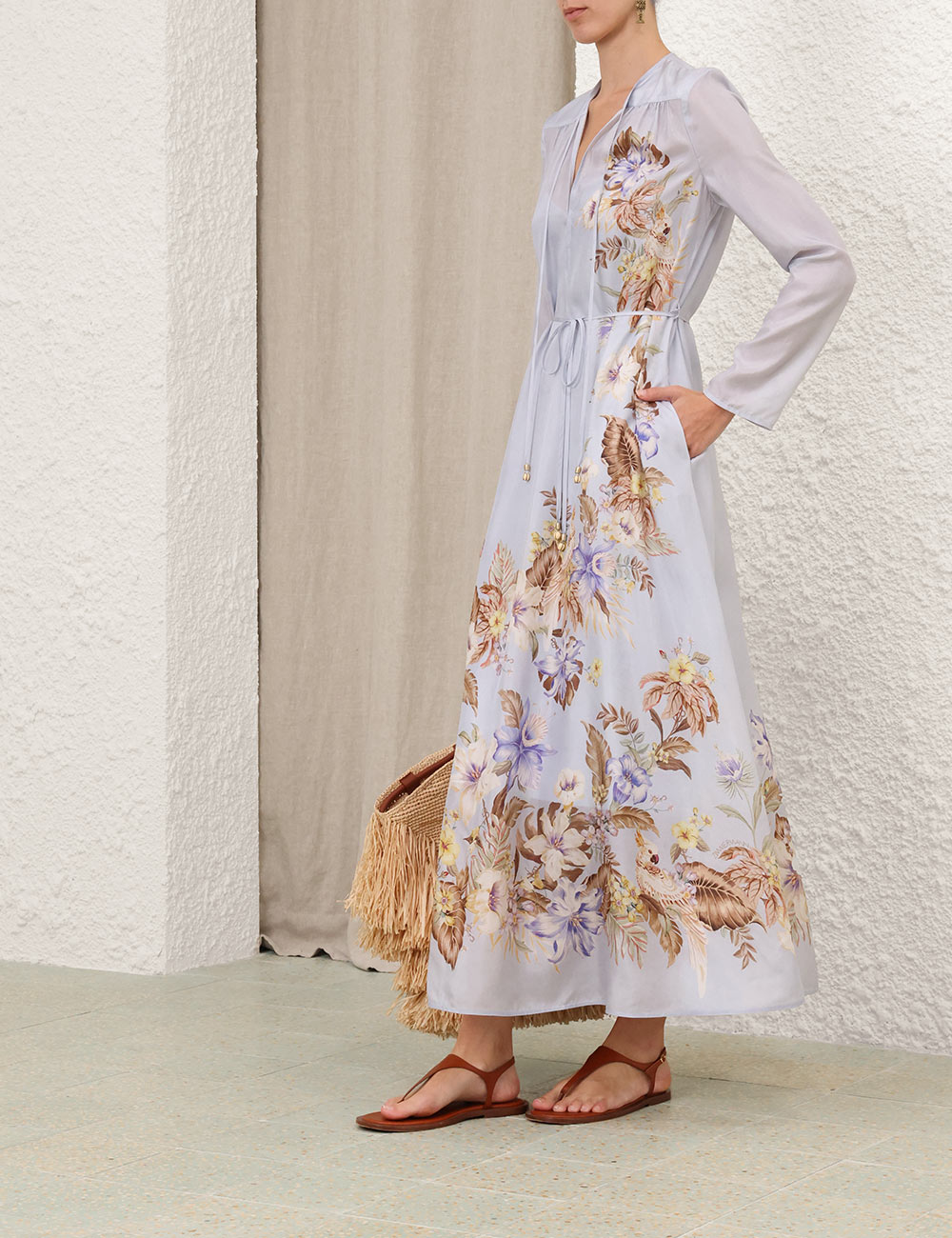 The Coco Billow Maxi Dress in Powder Blue Multi Floral from our Summer Swim 2025 Collection. A silk maxi dress featuring a self-rouleau neck tie and waist belt with wooden beaded toggles, finished with a loose fitting skirt. 100% silk habutae fabric, long sleeve maxi dress, placement printed, gathers at upper back, removable skinny self-rouleau belt, hook and eye closure at centre front, comes with separate slip