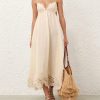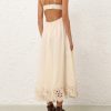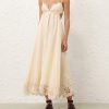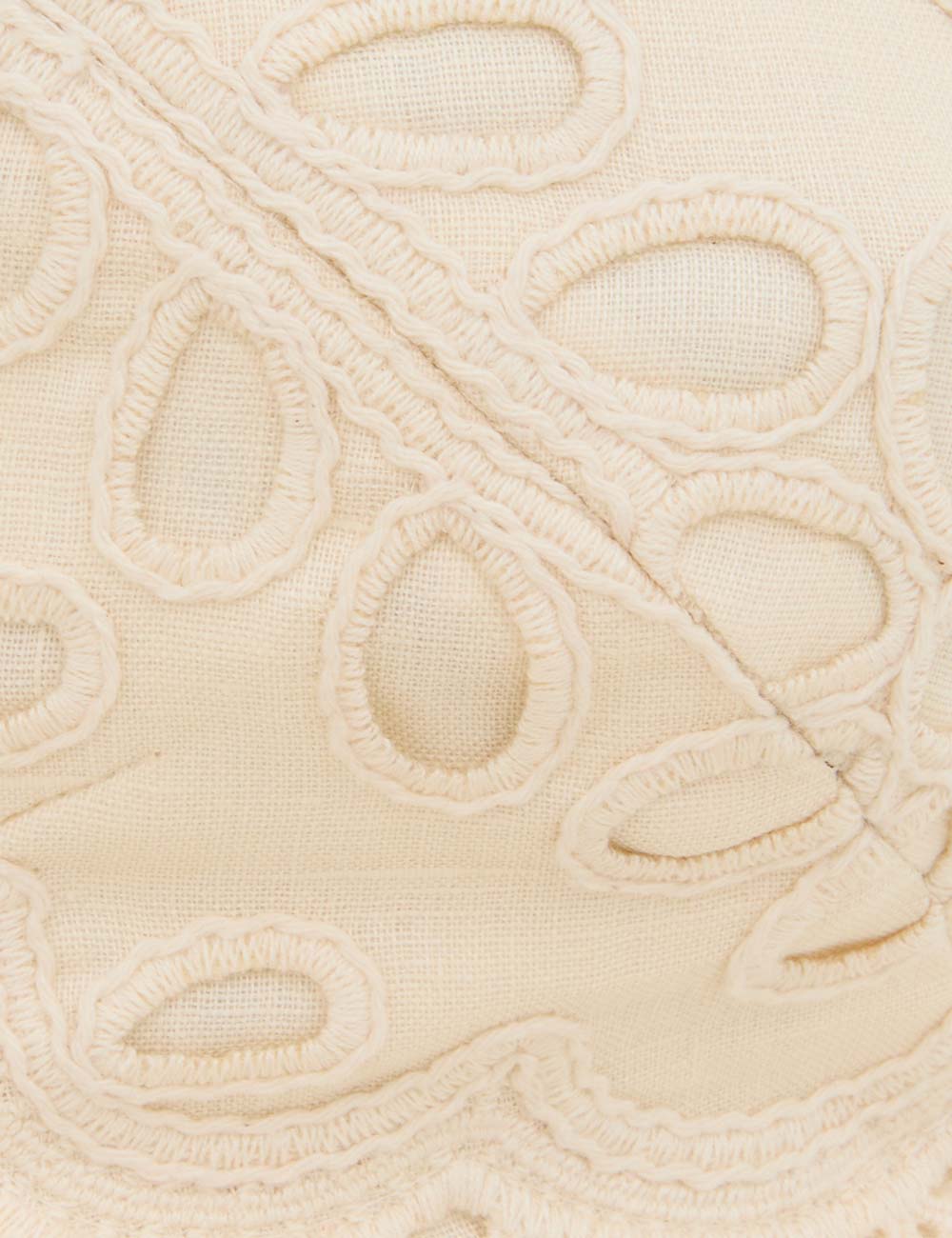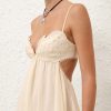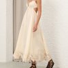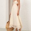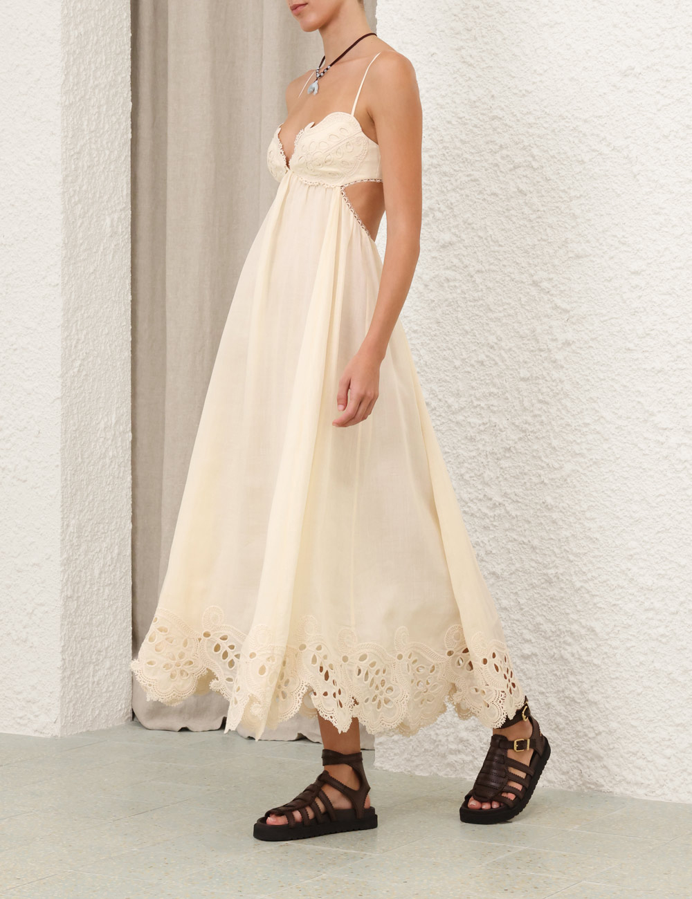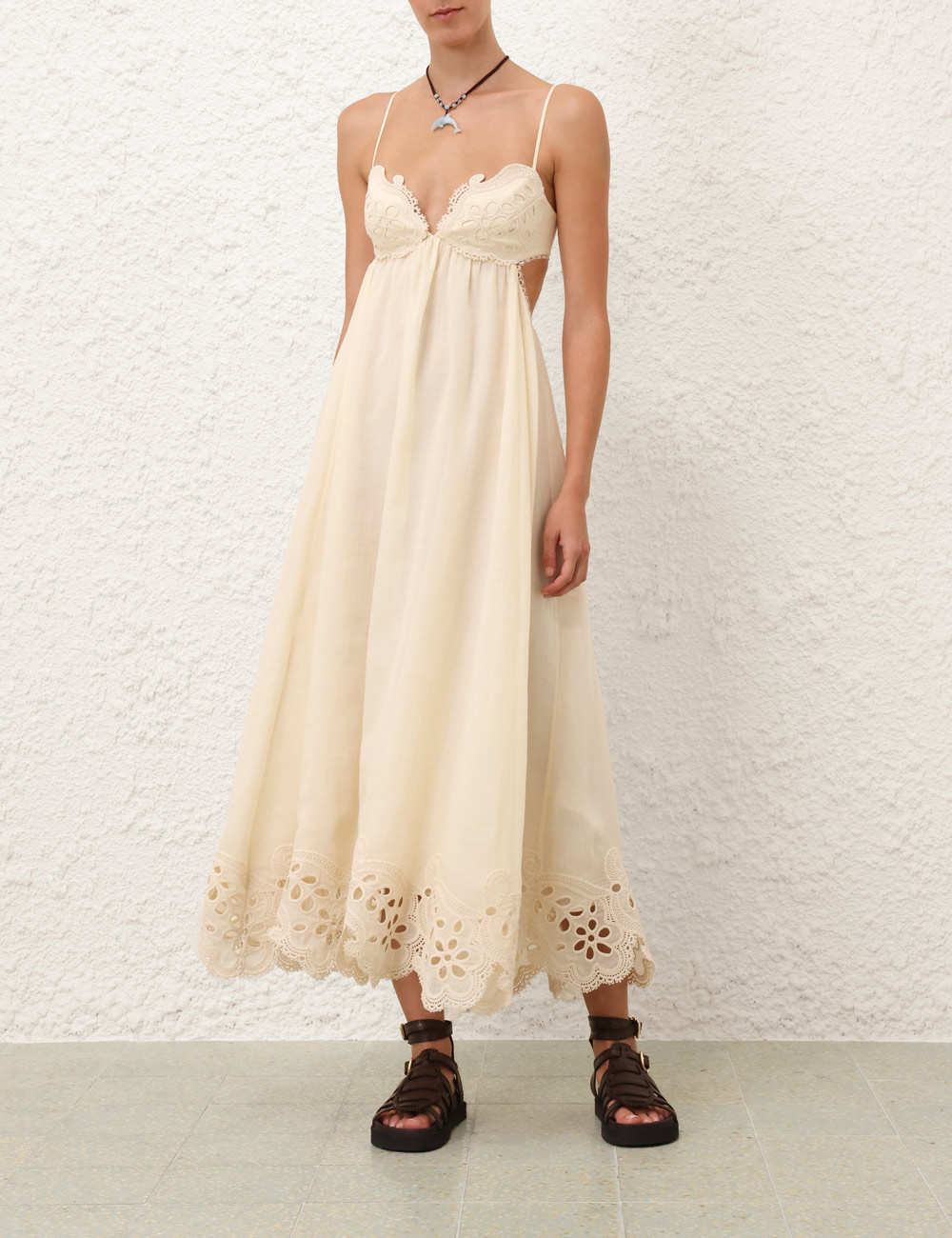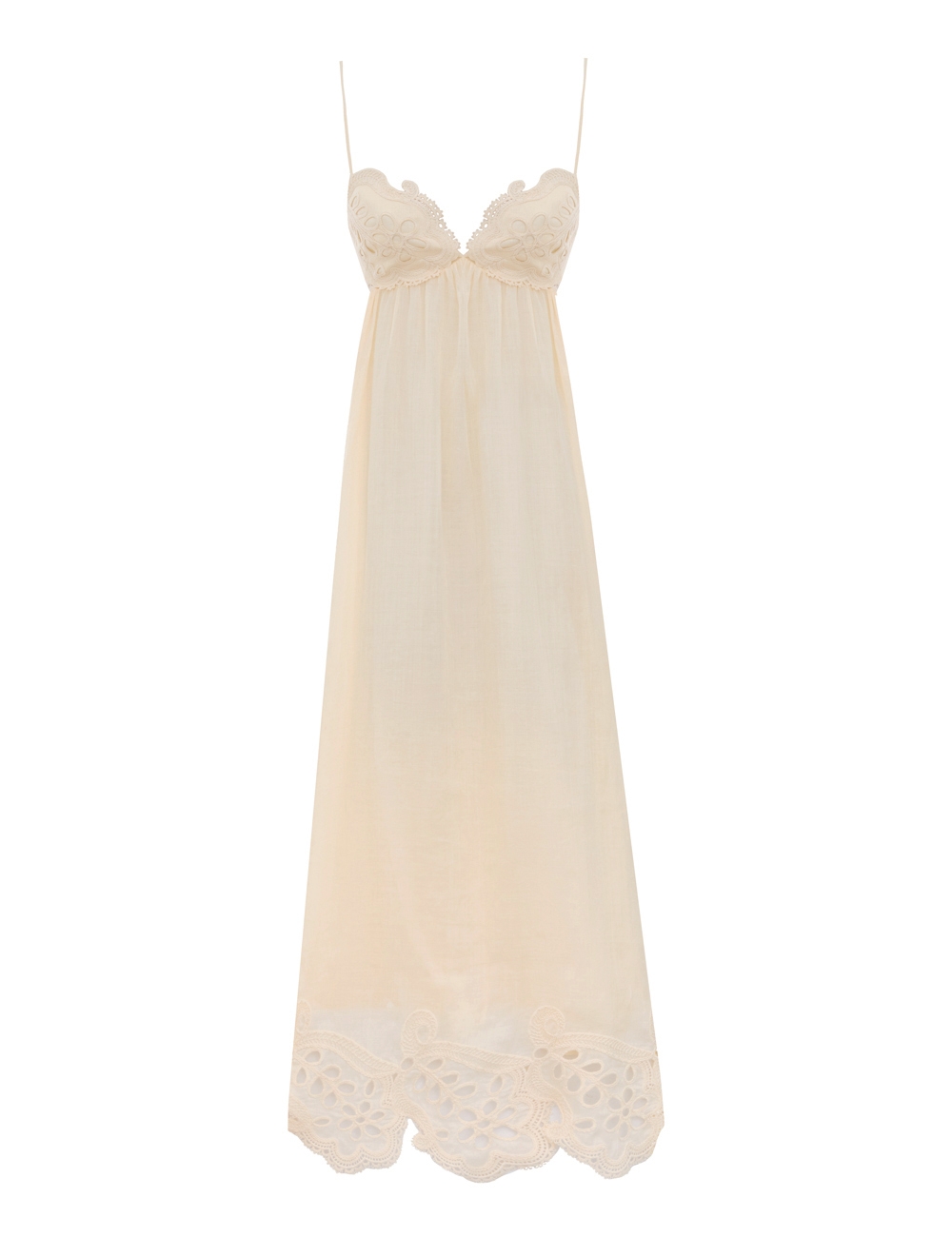 The Coco Embroidered Dress in Cream from our Summer Swim 2025 Collection. A ramie maxi dress featuring embroidery detail throughout, a V-neckline and a shirred back, finished with a gathered waist. 100% ramie fabric, scalloped lace trim, adjustable shoulder straps, shirred elastic across the back with hook and eye closure, invisible zip at scooped lower back, skirt is lined