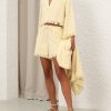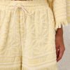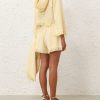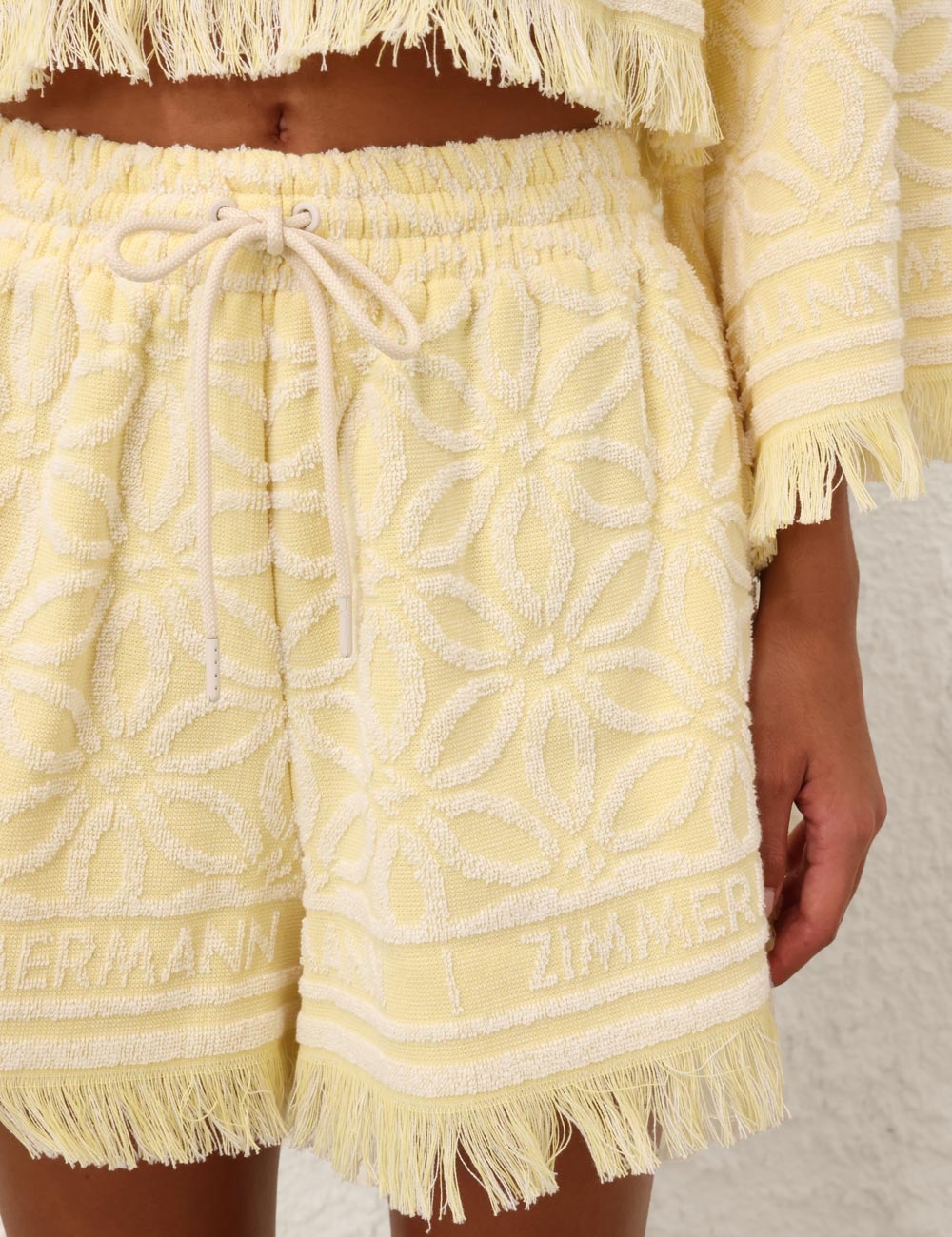 The Coco Towelling Short in Yellow/Cream from our Summer Swim 2025 Collection. A terry towelling short featuring an elasticated waistband and embroidery detailing throughout, finished with a fringe hem.100% cotton fabric, mid-rise short, shirred waistband with drawstring and toggle ends, fringe edging on hem, functional side pockets, zimmermann embroidered on front and back