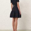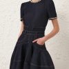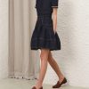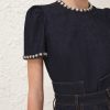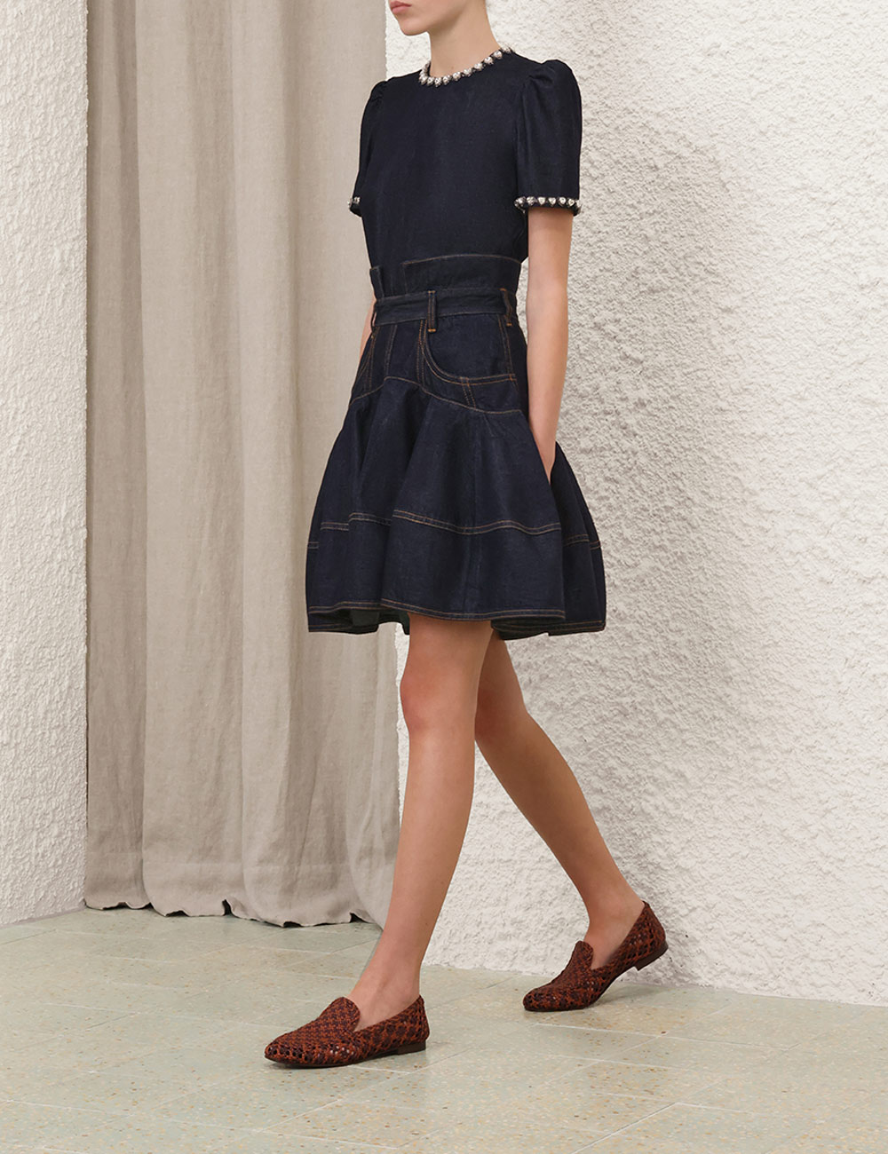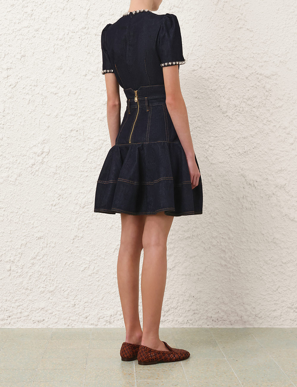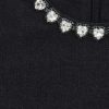 The Embellished Denim Top in Night Sky from our Fall 2025 Collection, Hypnotic. A short sleeve denim top featuring heart crystal trim on the neckline and cuffs, finished with a tulle-inserted sleeve head and invisible zipper at centre back.100% cotton denim, heart-shaped jewel crystal trim at sleeves and neckline, invisible zip closure at centre back, gathered shoulders creating a puffed silhouette