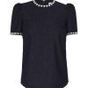The Embellished Denim Top in Night Sky from our Fall 2025 Collection, Hypnotic. A short sleeve denim top featuring heart crystal trim on the neckline and cuffs, finished with a tulle-inserted sleeve head and invisible zipper at centre back.100% cotton denim, heart-shaped jewel crystal trim at sleeves and neckline, invisible zip closure at centre back, gathered shoulders creating a puffed silhouette