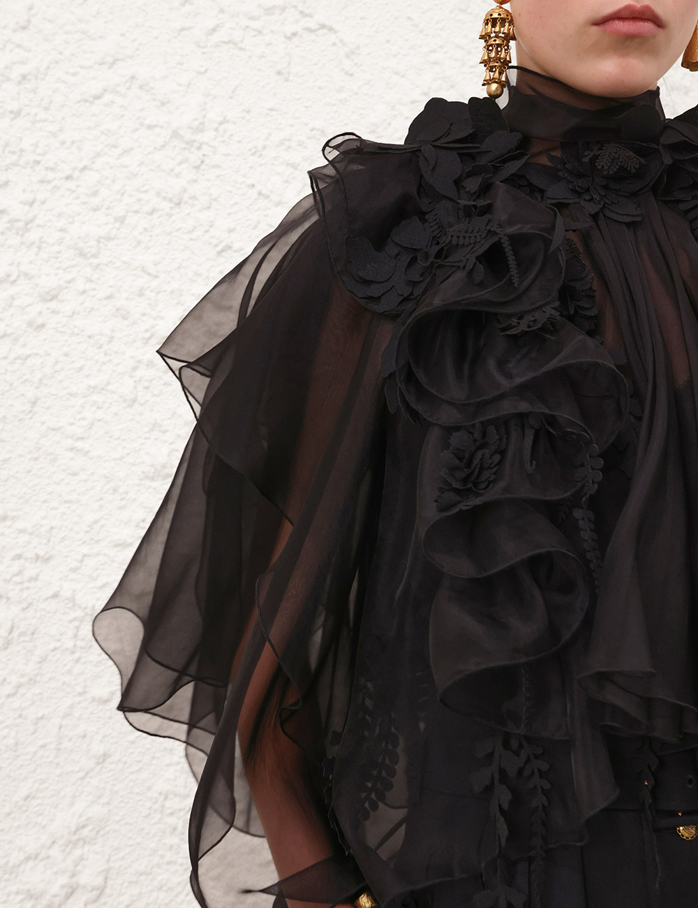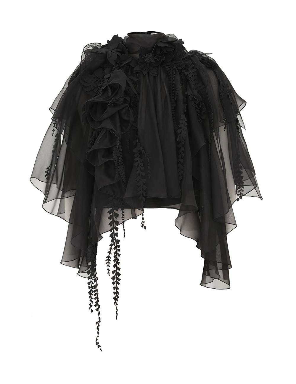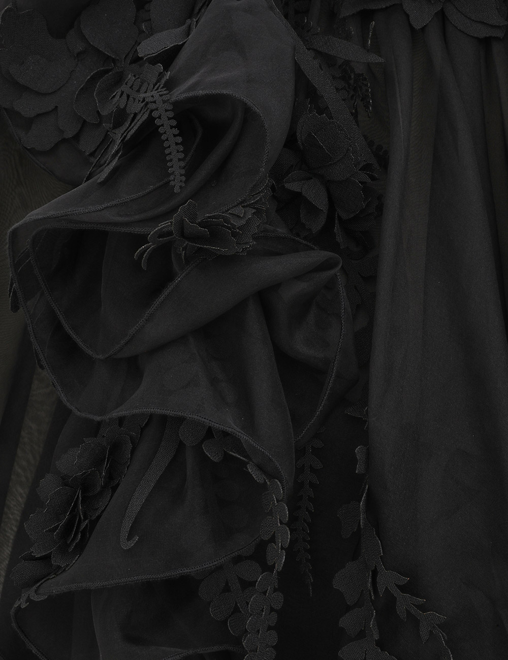 The Hypnotic Applique Cascade Top in Black from our Fall 2025 Collection, Hypnotic. A silk cropped-fit top featuring cascading organza ruffle layers and floral applique throughout. 100% silk fabric, self-tie bow at neckline, laser-cut flower applique, high-low hem silhouette, invisible zip closures at centre back and left side, comes with separate cami