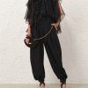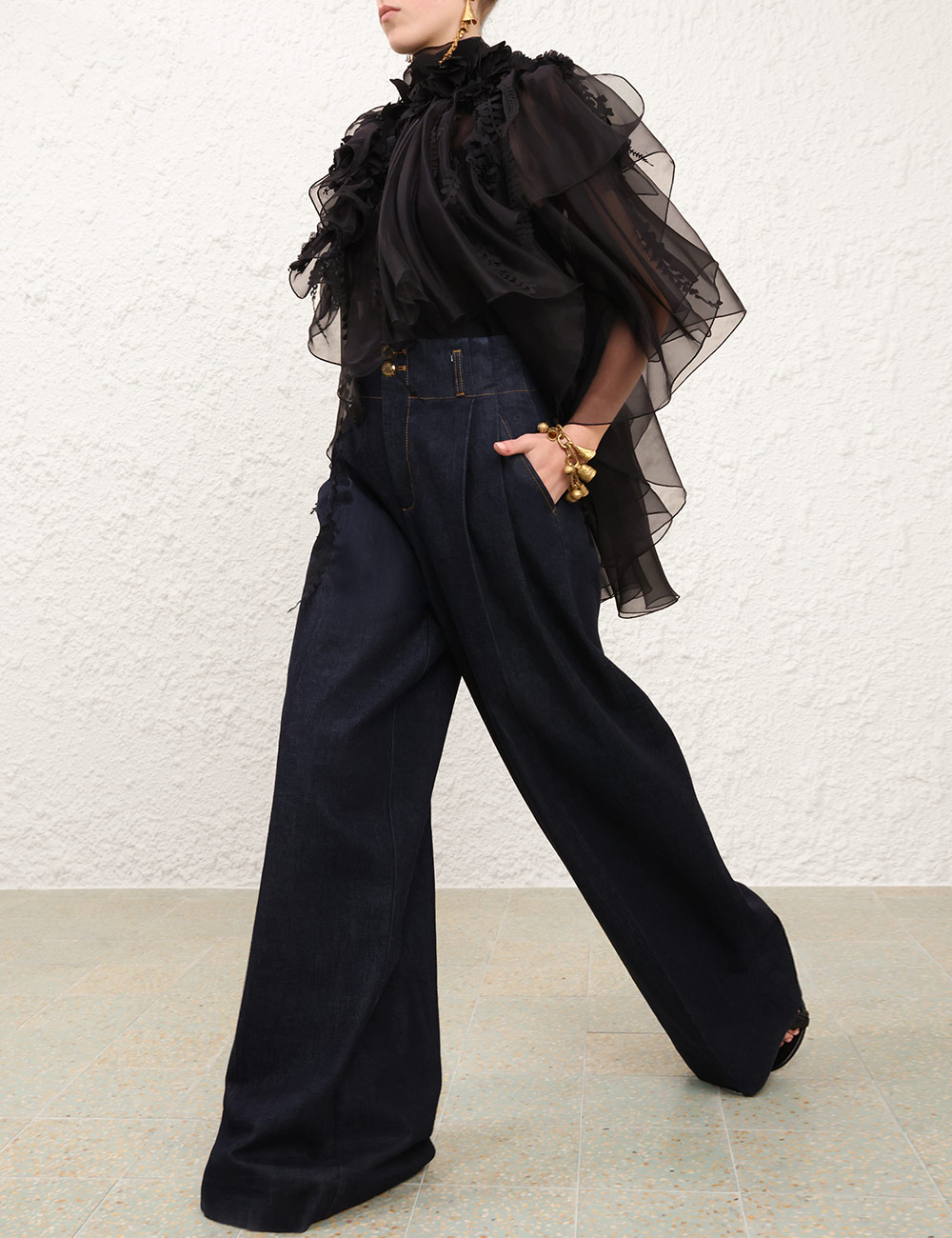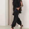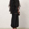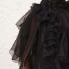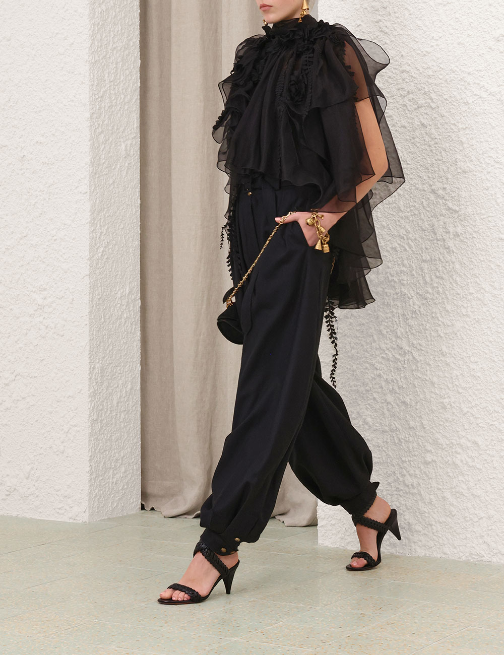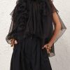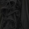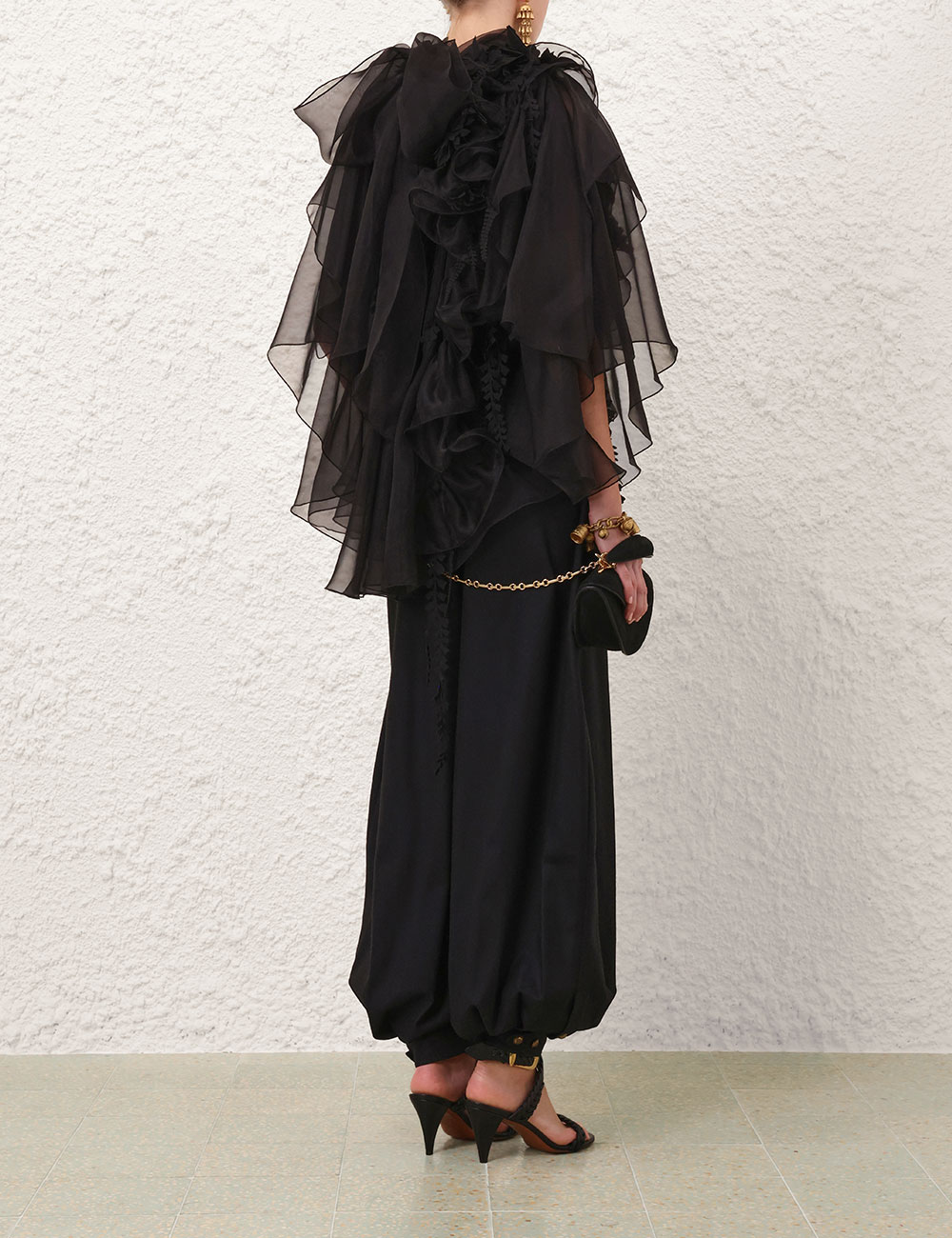 The Hypnotic Applique Cascade Top in Black from our Fall 2025 Collection, Hypnotic. A silk cropped-fit top featuring cascading organza ruffle layers and floral applique throughout. 100% silk fabric, self-tie bow at neckline, laser-cut flower applique, high-low hem silhouette, invisible zip closures at centre back and left side, comes with separate cami