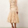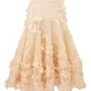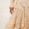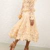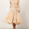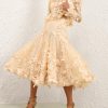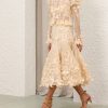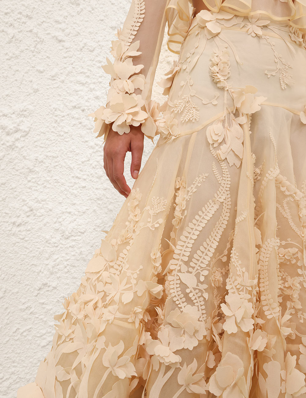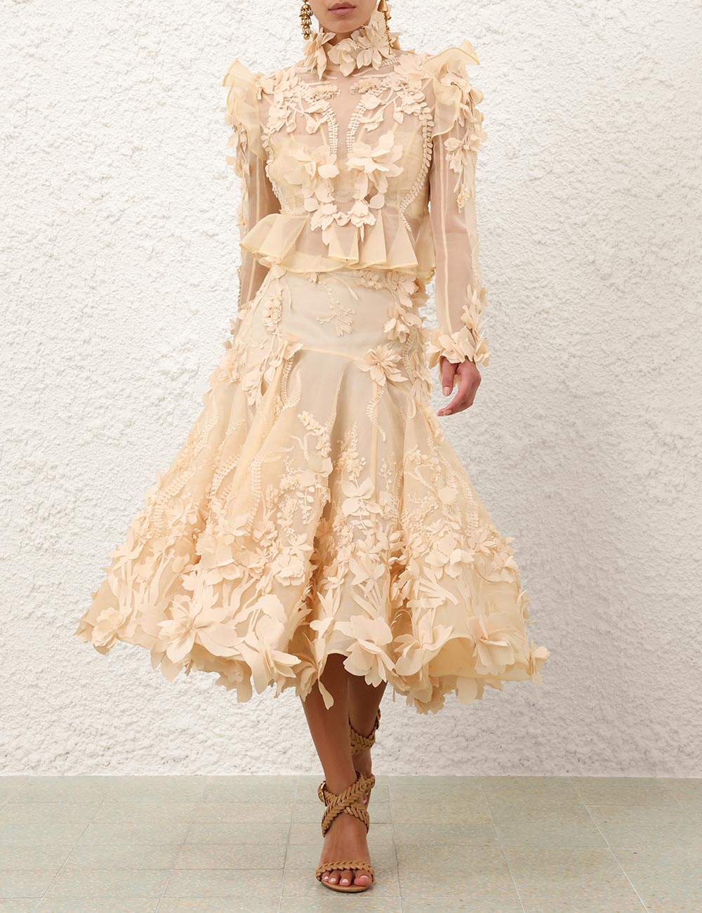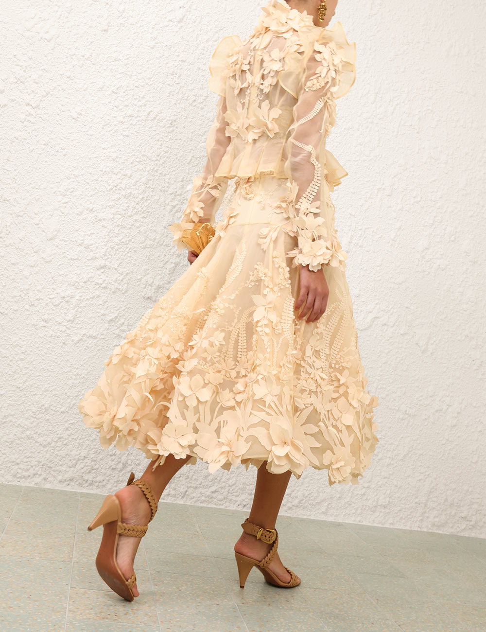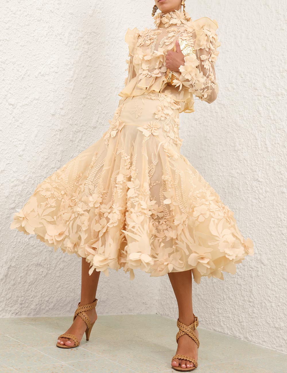 The Hypnotic Applique Midi Skirt in Cream from our Fall 2025 Collection, Hypnotic. An A-line full skirt featuring 3D flower applique detailing throughout. 100% silk fabric, high-waisted skirt with boning, laser-cut flower applique, invisible zip closure at centre back, tulle backing for added volume, fully lined