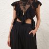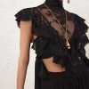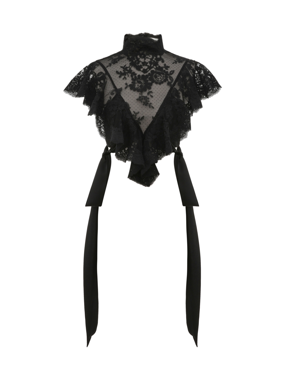 The Hypnotic Lace Bodice in Black from our Fall 2025 Collection, Hypnotic. A lace bodice featuring ruffle detailing and decorative side bow ties. centre back invisible zip closure, side bodice panel with additional side zip, lace trim applique around collar and frills