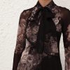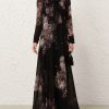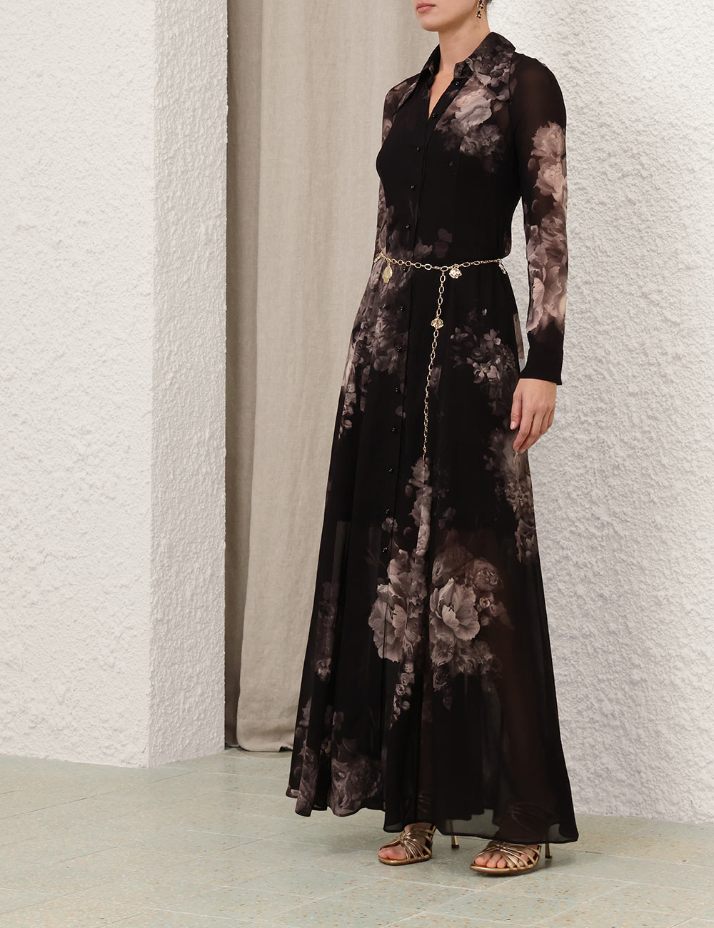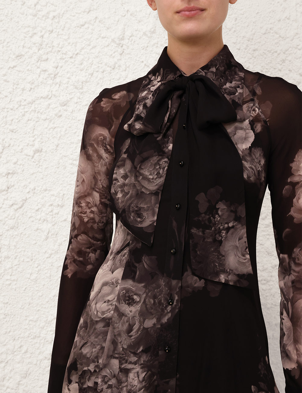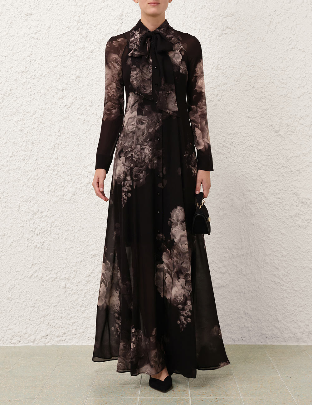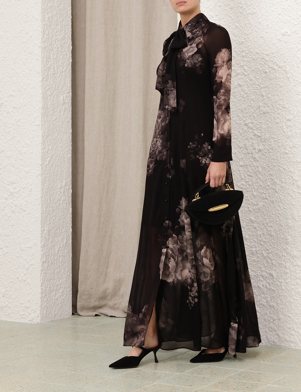 The Hypnotic Maxi Shirt Dress in Ghost Floral from our Fall 2025 Collection, Hypnotic. A long sleeve dress featuring a classic collar, pussybow necktie and buttons down the centre front. shirt style maxi dress, removable self-rouleau necktie, long fitted sleeves and cuffs, buttons down centre front placket, comes with a separate slip