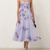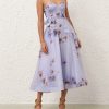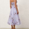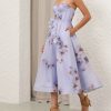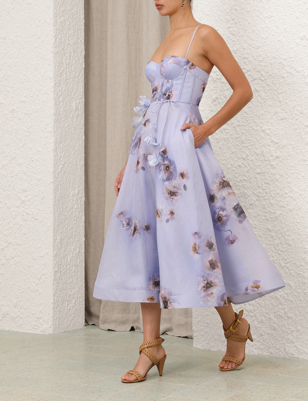 The Hypnotic Picnic Dress in Lilac Poppy from our Fall 2025 Collection, Hypnotic. A silk linen midi dress featuring a sweetheart neckline, a structured bustier bodice and a full flared skirt.structured bodice with boning and underwire, adjustable straps for versatile fit, removable rouleau belt with flower trim, shirred back with invisible zip closure, flared skirt, side seam pockets