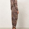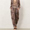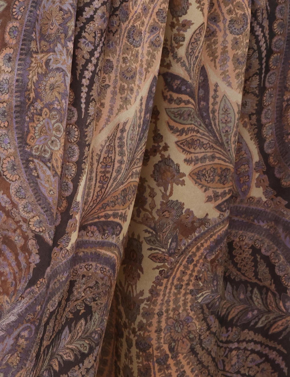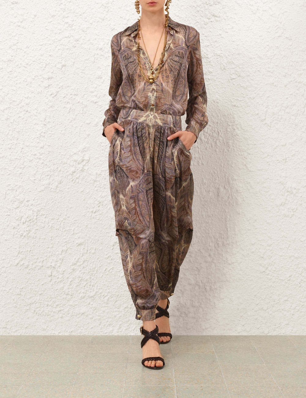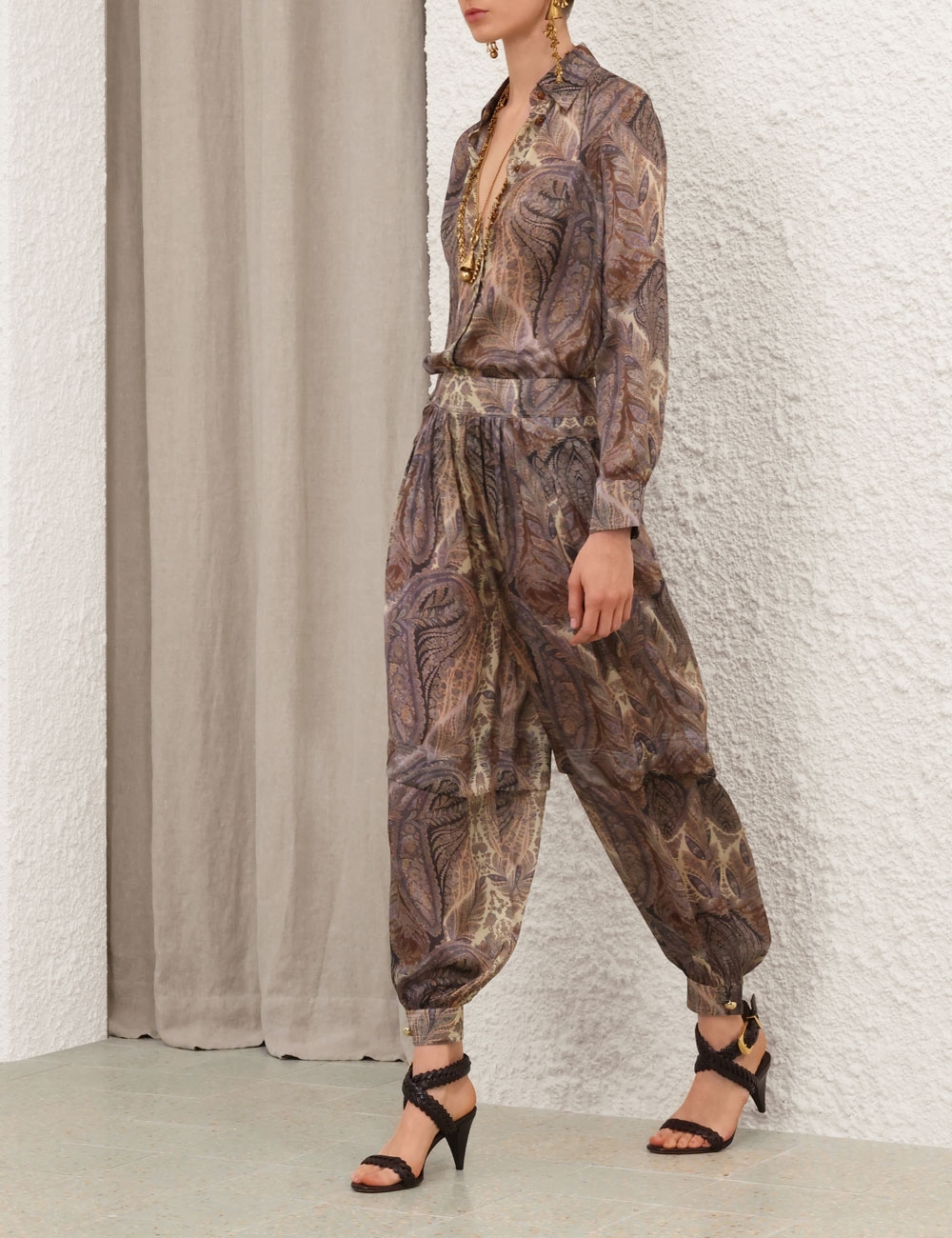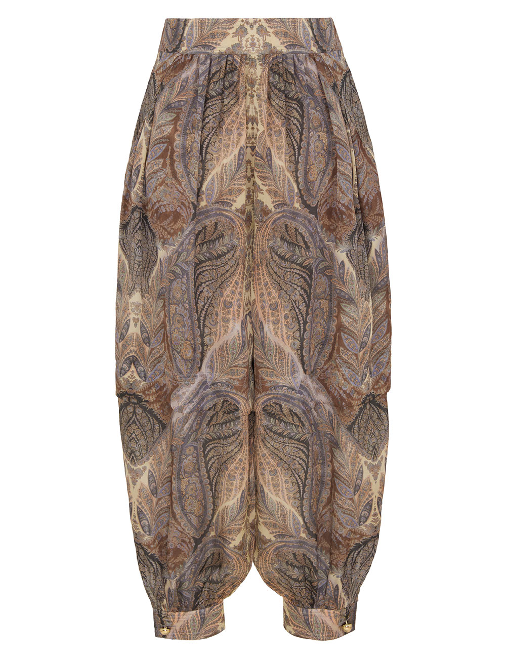 The Hypnotic Silk Harem Pant in Denim Paisley from our Fall 2025 Collection, Hypnotic. A high waisted silk harem pant with a gathered waist and fitted ankle cuffs. 100% silk fabric, buttoned ankle cuffs, side pockets, heavily gathered throughout, invisible zip closure at centre back