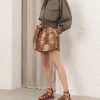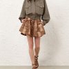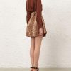The Hypnotic Utility Mini Skirt in Toffee Snake from our Fall 2025 Collection, Hypnotic. A silk blend mini skirt featuring a removable D-ring waist belt and functional front patch pockets.silk cotton mini skirt, utility silhouette, button closure down the centre front, adjustable d-ring belt, functional side patch pockets, topstitching throughout, asymmetrical hem, partially lined