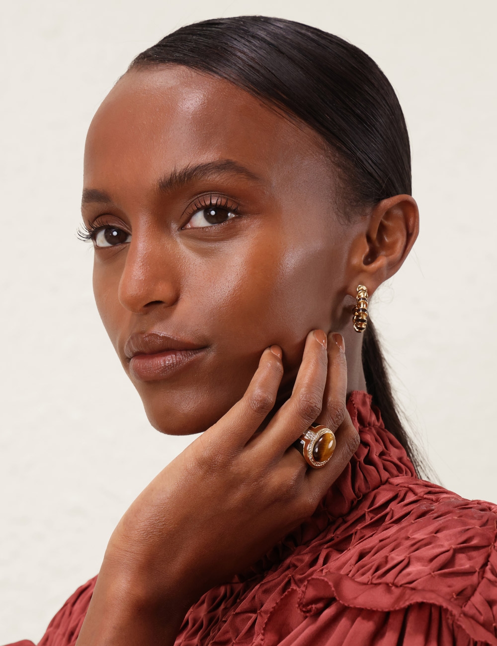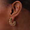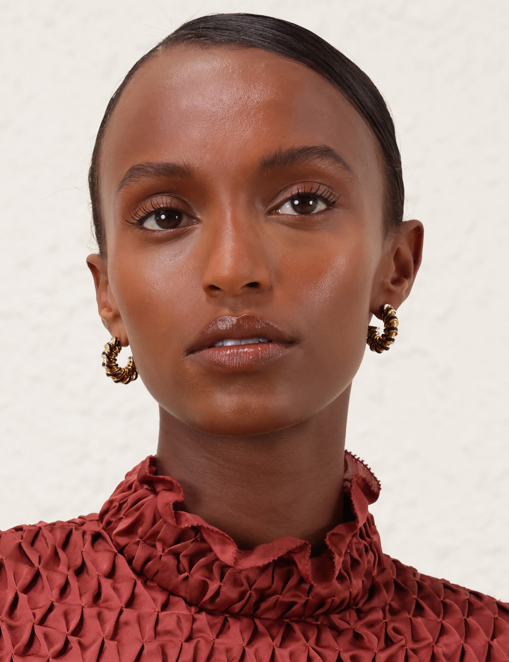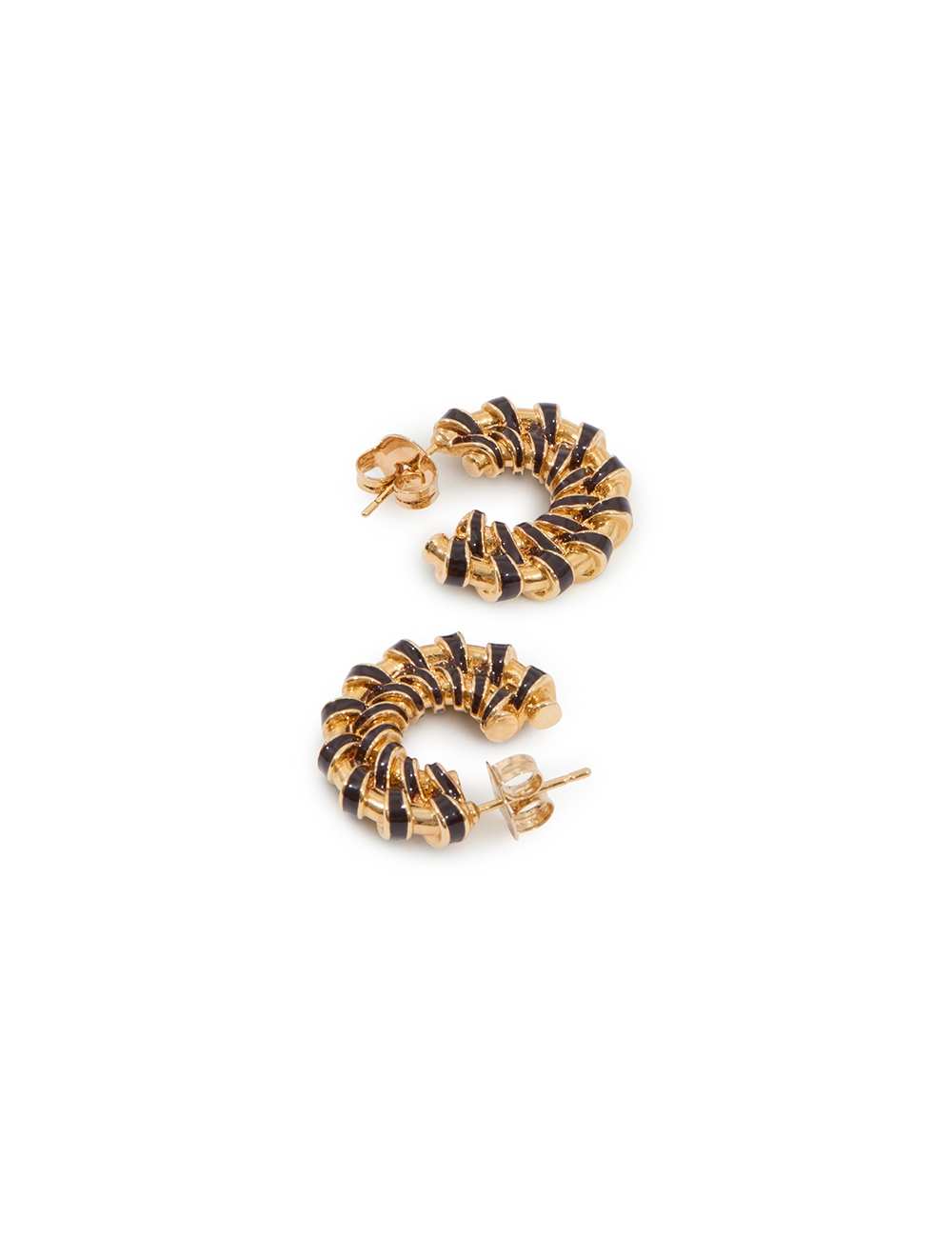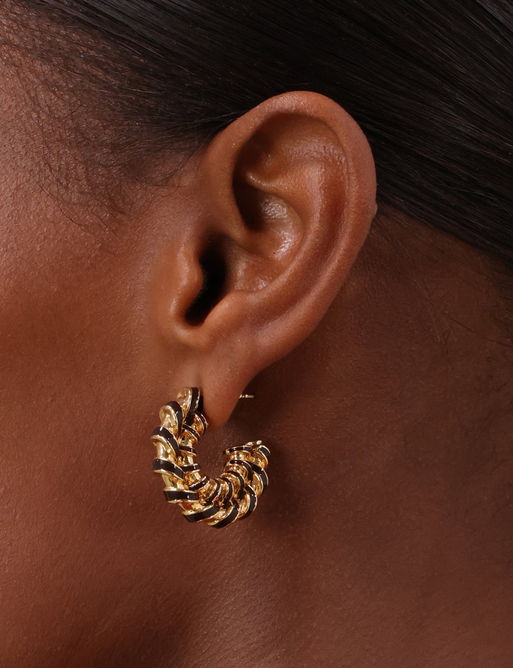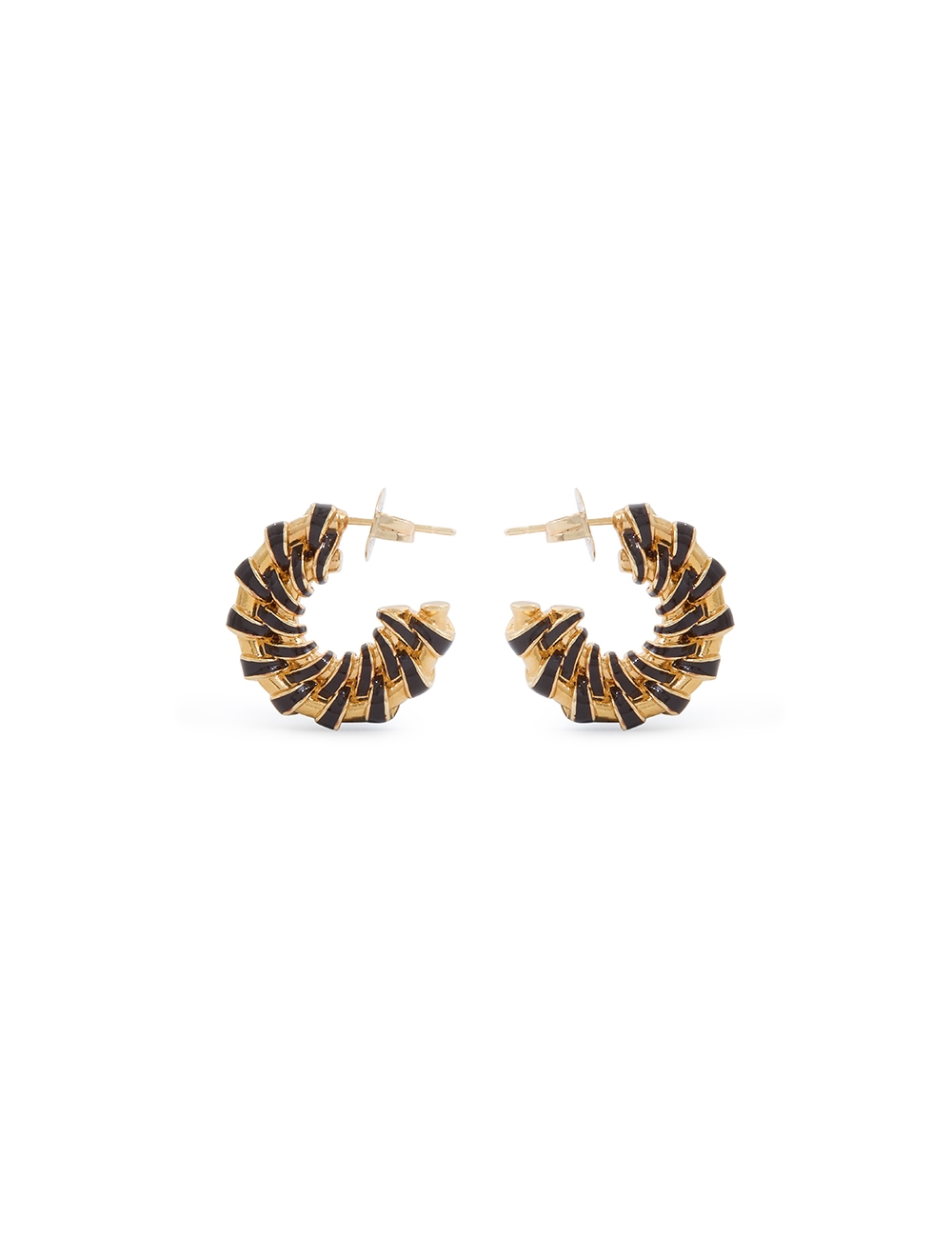 The Loom Mini Hoops in Gold/Burgundy from our Fall 2025 Collection, Hypnotic. A gold plated statement earring featuring twisted brass detailing and a stud post back.12kt gold plated brass hoops, enamel detailing in deep burgundy hues, stud post back, sold as a pair
