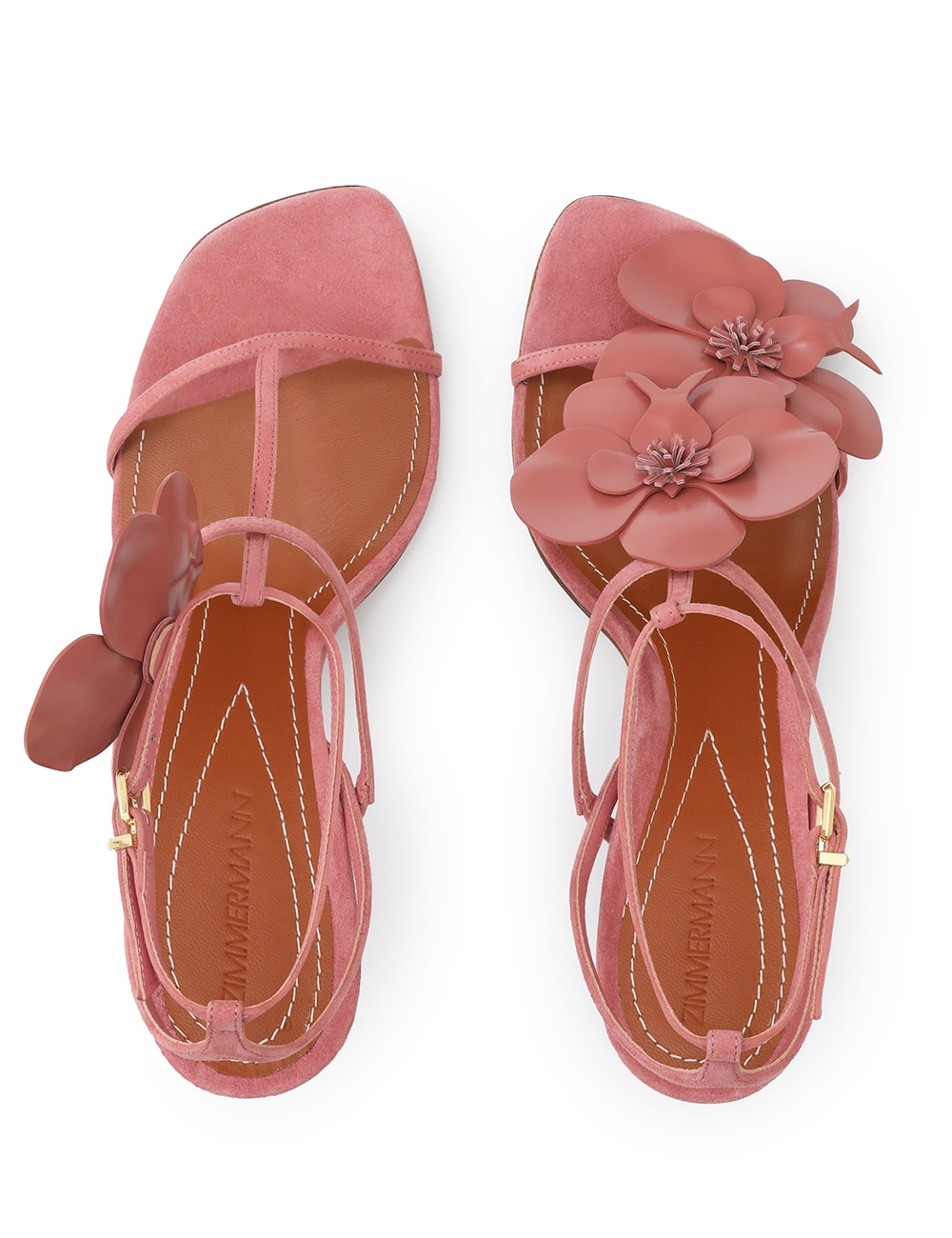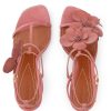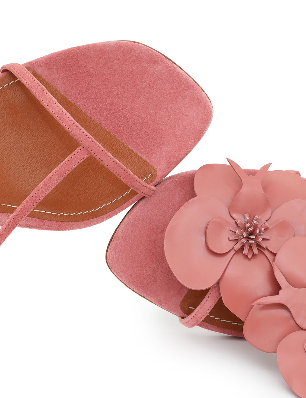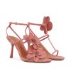 The Orchid Sandal 85 in Coral from our Fall 2025 Collection, Hypnotic. Crafted in Italy, Orchid adds effortless sophistication to any look with fine strapping and custom-moulded leather orchids. suede and shiny leather stiletto sandal, asymmetric fixed orchid design, square toe, ankle strap with gold buckle hardware, 85mm stiletto heel, made in italy