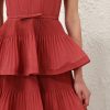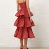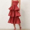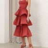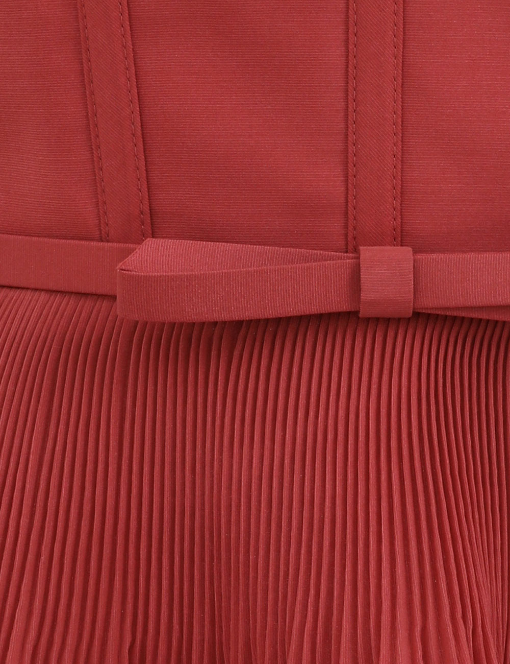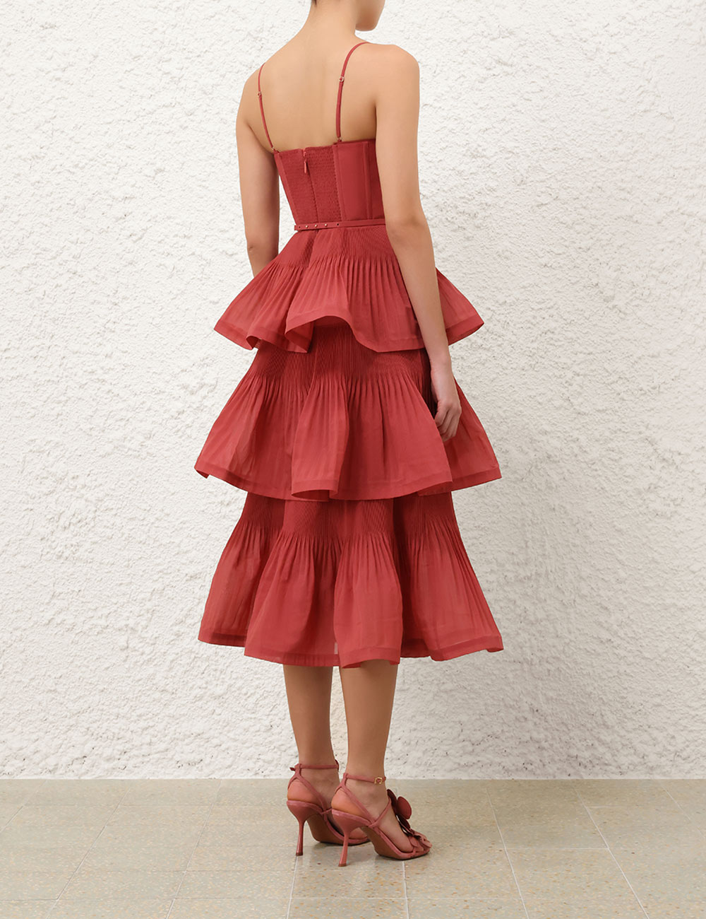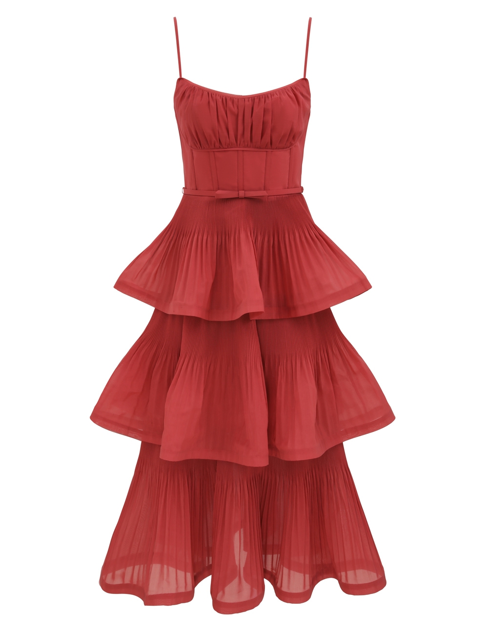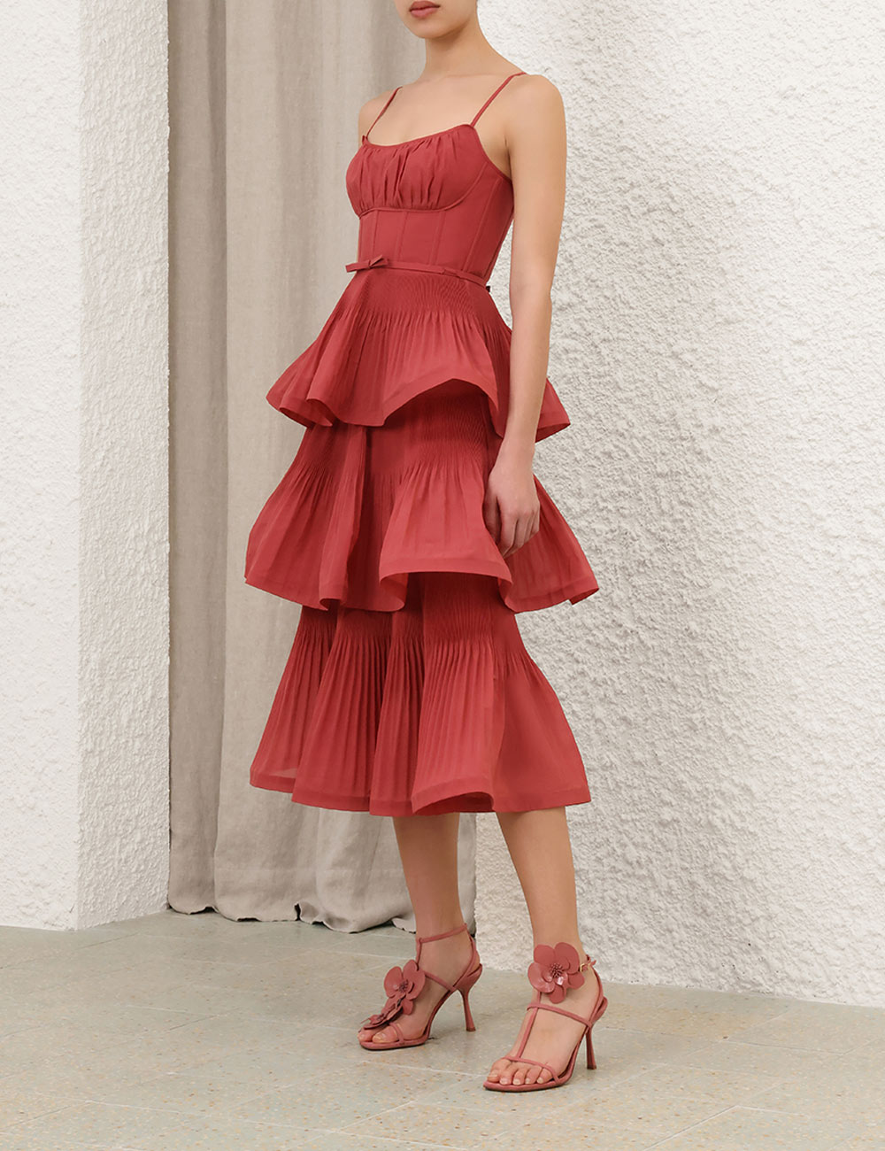 The Pleated Tiered Midi Dress in Rose from our Fall 2025 Collection, Hypnotic. A midi dress featuring a scoop neckline, adjustable shoulder straps, boning within fixed bodice and a heavily pleated tiered skirt.adjustable shoulder straps for flexible fit, shirred elastic across back with invisible zip closure, fixed waistband with internal boning for structure, removable belt with bow detailing, lined skirt
