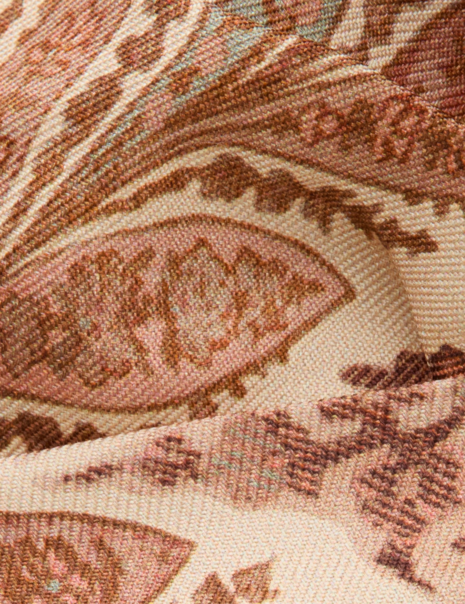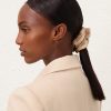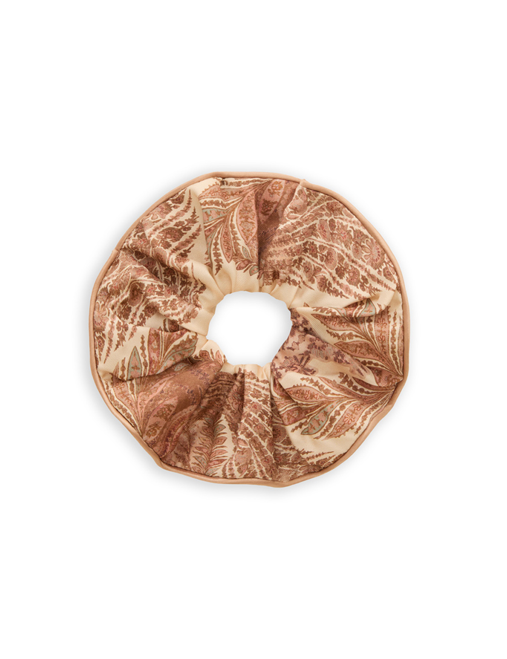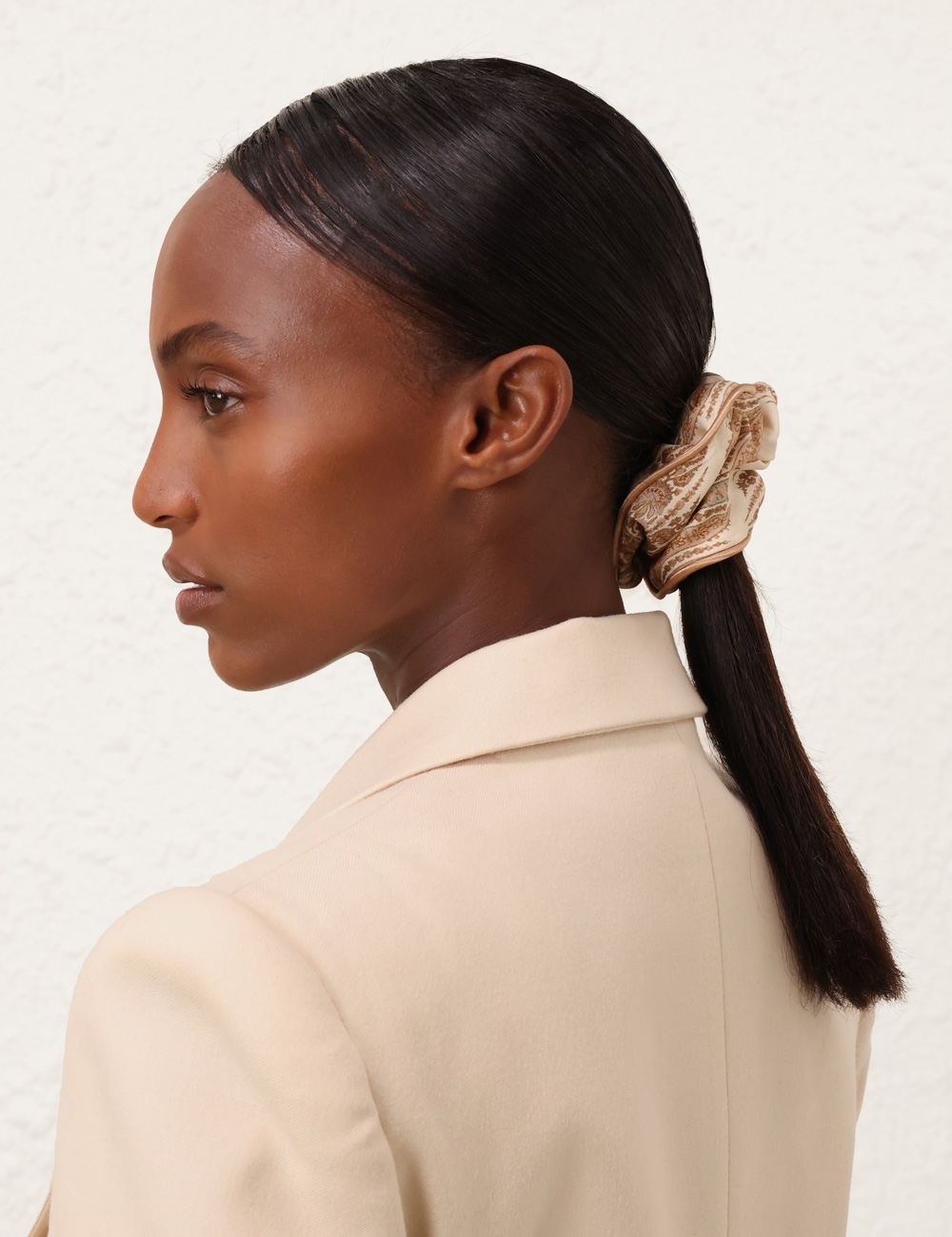 The Printed Silk Scrunchie in Cream Paisley from our Fall 2025 Collection, Hypnotic. A silk scrunchie featuring contrast piped edges. silk scrunchie, internal elastic