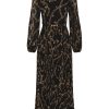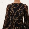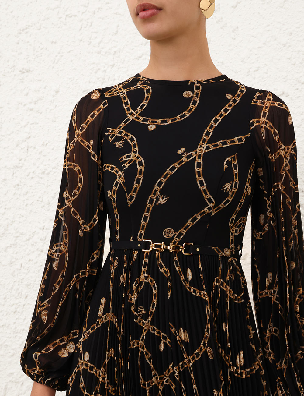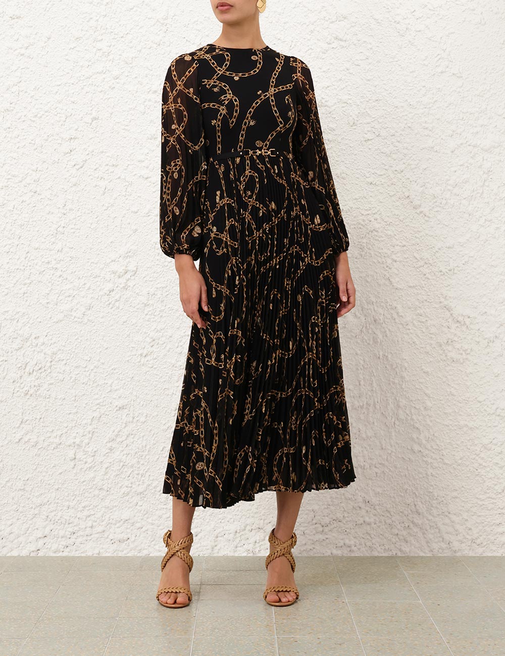 The Sunray Long Sleeve Dress in Black Charms from our Fall 2025 Collection, Hypnotic. A long sleeve dress featuring a round neckline, removable waist belt and long billow sleeves with elasticated cuffs, finished with a pleated style skirt.midi length dress, sunray pleated sleeves and skirt, invisible zip closure at centre back, heavily gathered, comes with a removable self covered belt, placement printed