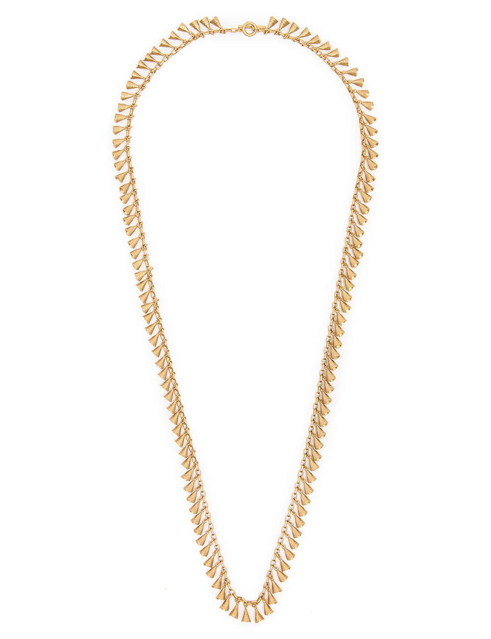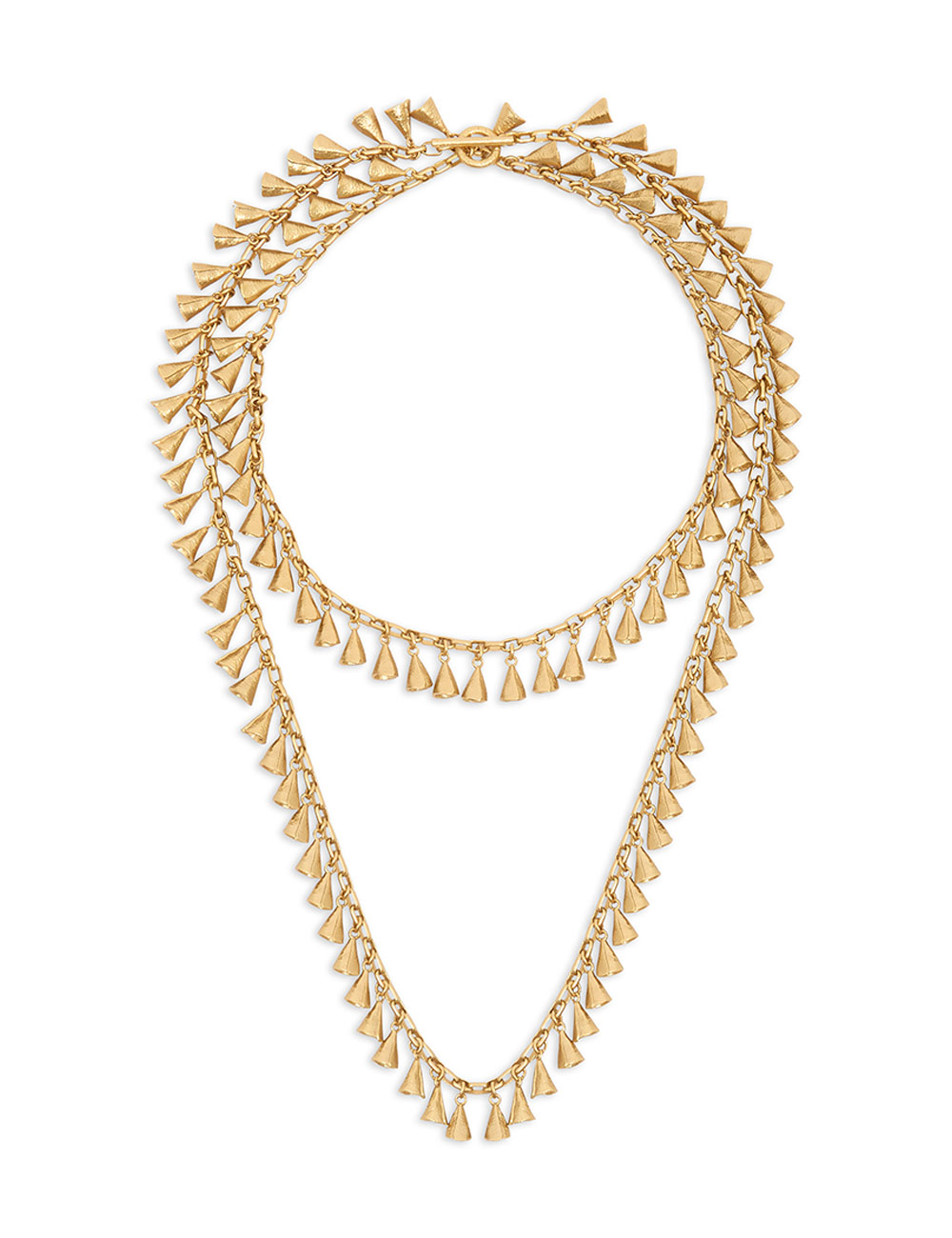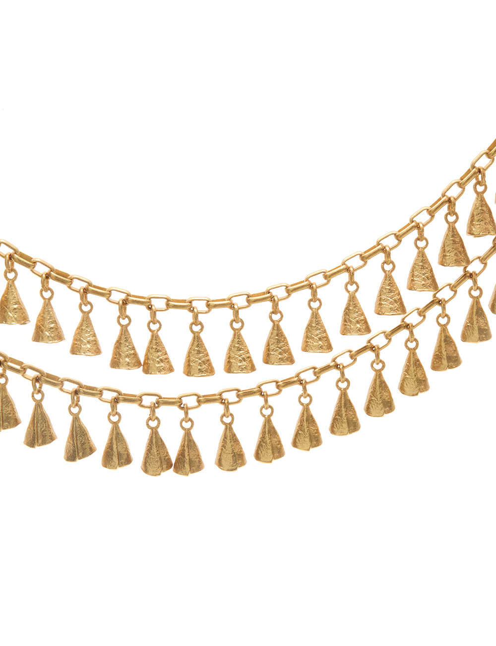 The Whimsy Necklace in Antique Gold from our Fall 2025 Collection, Hypnotic. A gold plated chain necklace featuring mini asymmetrical charms and a T-bar clasp.14kt gold plated brass necklace, delicate hammered charms with surface textures, custom branded t-bar clasp closure