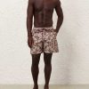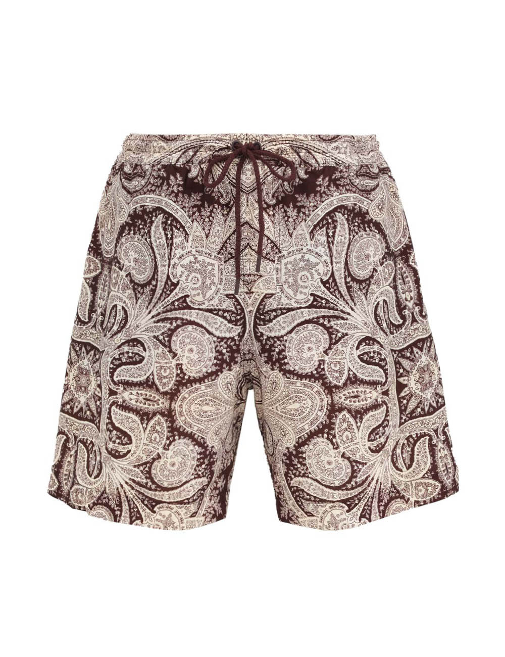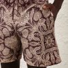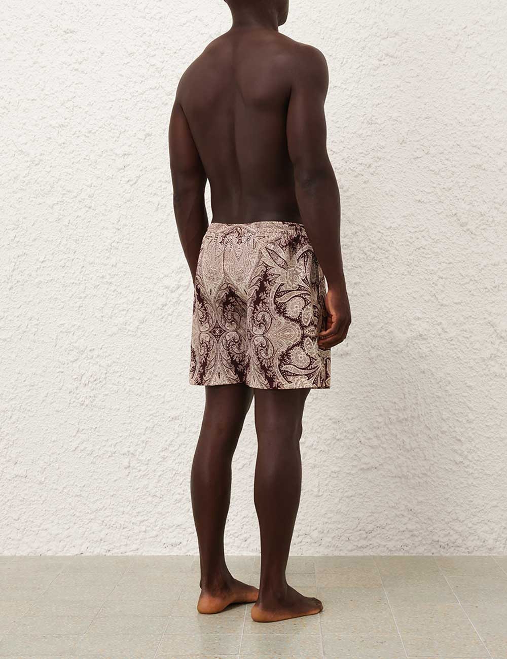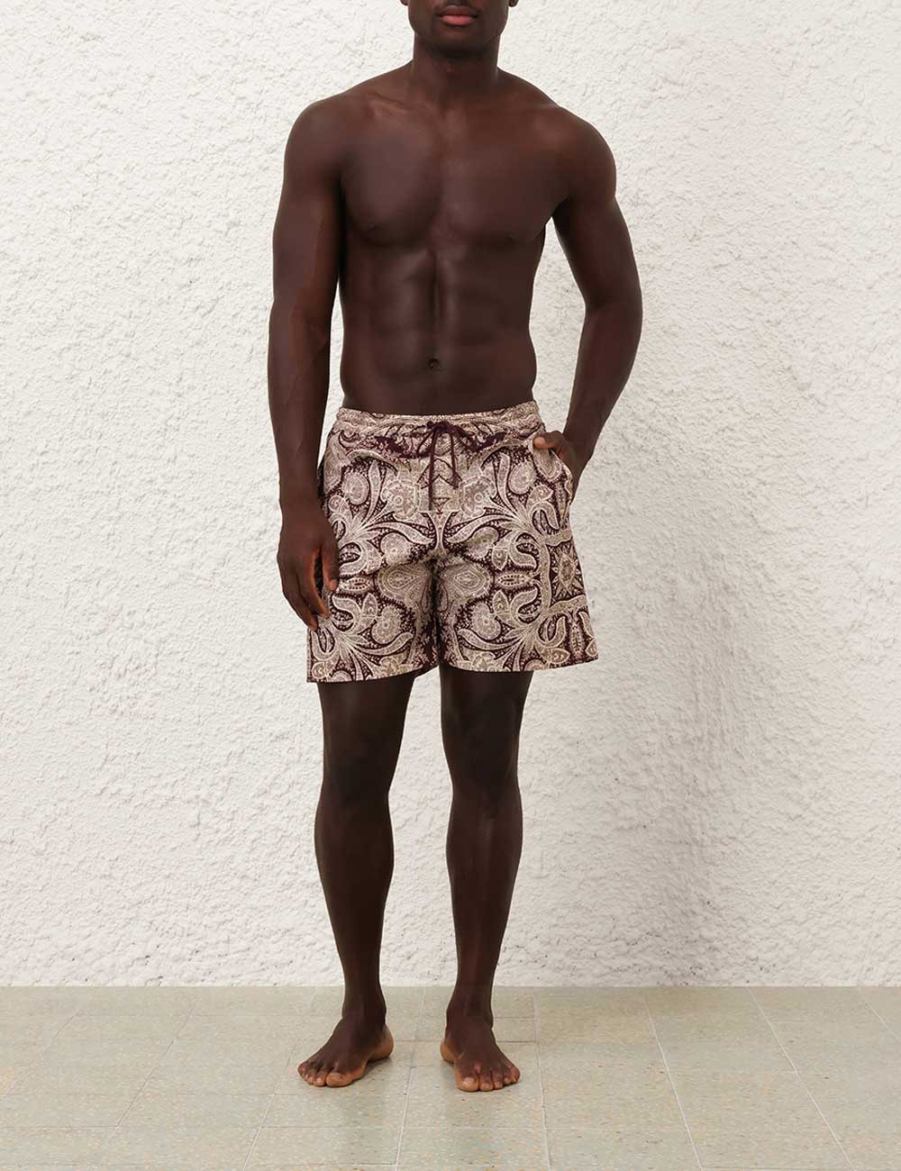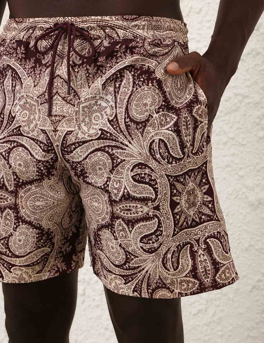 The Rhiannon Mens Boardshort in Chocolate Paisley from our Summer Swim 2025 Collection. A printed boardshort with elasticated waistband, drawstring cord, side seam pockets and inbuilt support mesh lining. relaxed boardshorts, elasticated waist with drawstring cord, side inseam pockets, mesh lining